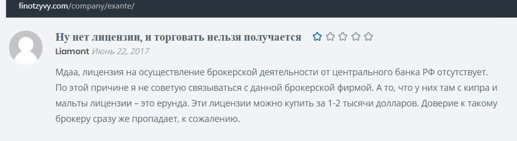У Экзанте нет каких-либо разрешений в виде лицензий от финансовых регуляторов, дающих право данной брокерской компании работать на территории России. Именно об этом пишет автор последующего отзыва об этом ДЦ.