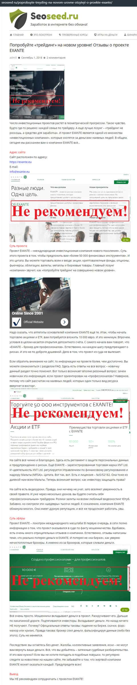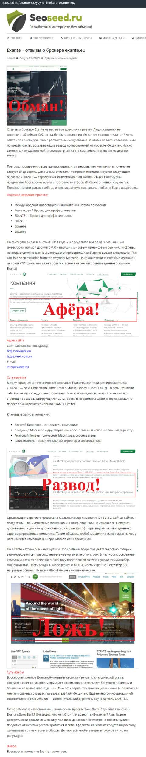 Информация о мошенничестве в конторе Экзанте также представлена и на информационном интернет-ресурсе seoseed ru. Материал о Exante, где подробно рассмотрена организационная структура сего scam-брокера опубликован был 15 августа 2019 года.