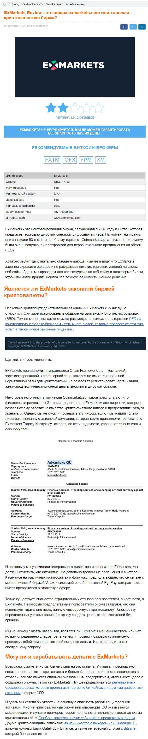 EXMarkets - очередная криптовалютная биржа, которая обманывает пользователей, ворует у них деньги, и судя по всему подчищает негативную информацию о своей компании во всемирной паутине, данная скам-организация как и большинство аналогичных компаний зарегистрирована в оффшоре, а именно на Британских Виргинских островах. Обходите стороной и не связывайтесь с лохотронщиками ЕХ Маркетс !!!