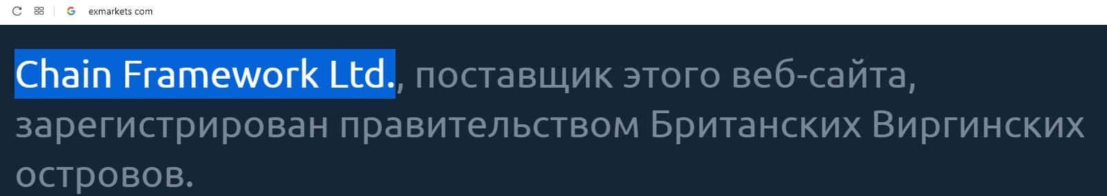 Юридическое лицо Chain Framework Ltd владеет мошенническим сервисом exmarkets com, компании ЕХ Маркетс, у которой оффшорная регуляция.