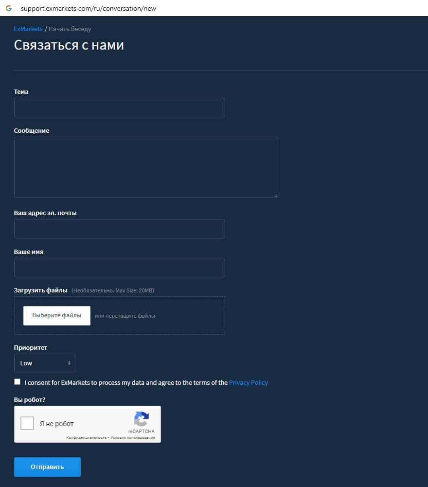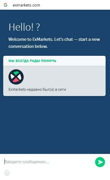 Также жулики ЕХ Маркетс предоставили в качестве обратной связи онлайн-чат, при помощи которого ведут сбор данных о клиенте, фиксируя все данные на сайте.