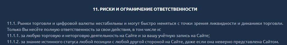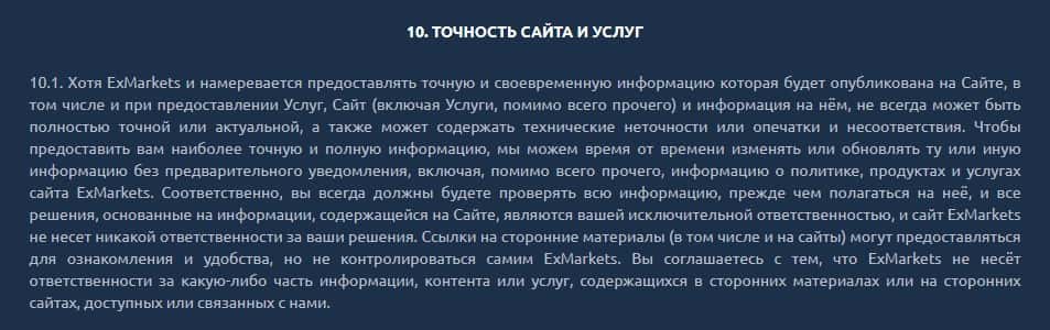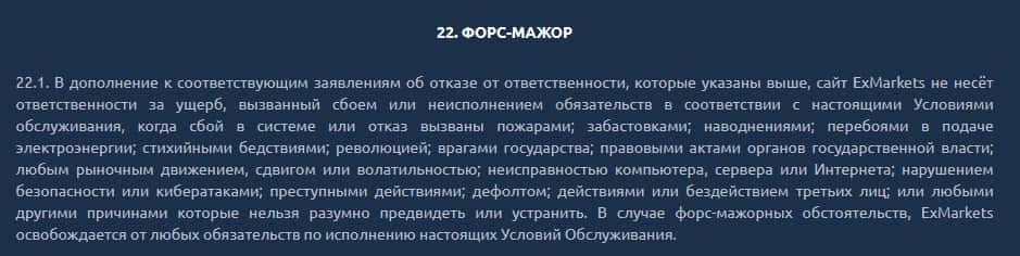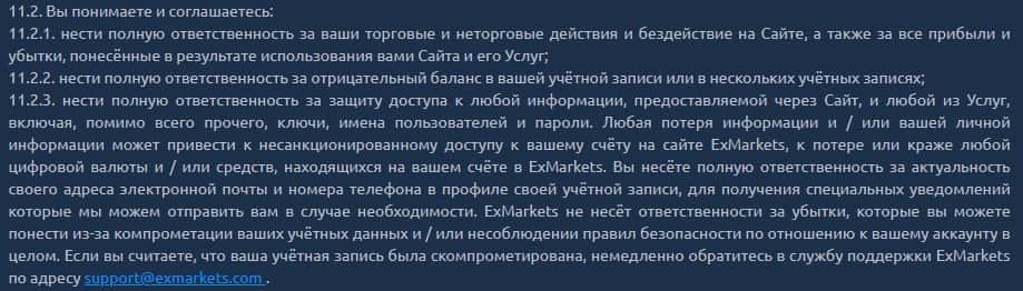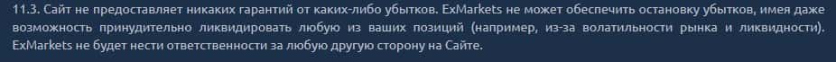 Согласно тому, что аферисты пишут в соглашении, скам-компания EXMarkets не несет никакой ответственности за не полученную прибыль клиентом, а также за вероятные убытки.