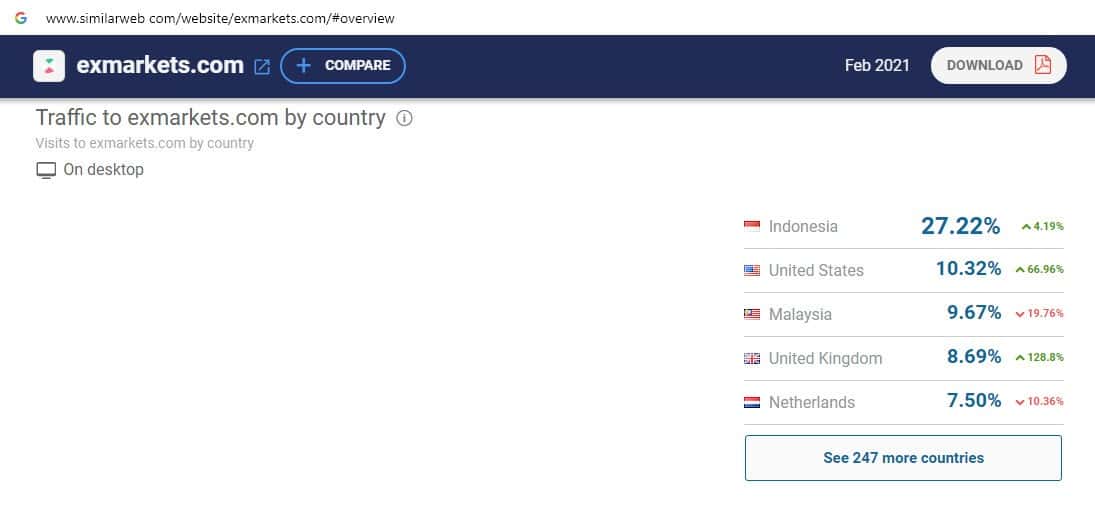 При проверке посещаемости онлайн-ресурса жульнической конторы ЕХ Маркетс на similarweb com оказалось, что среди трафика есть пользователи из Индонезии и США.