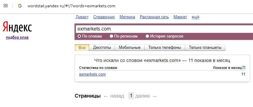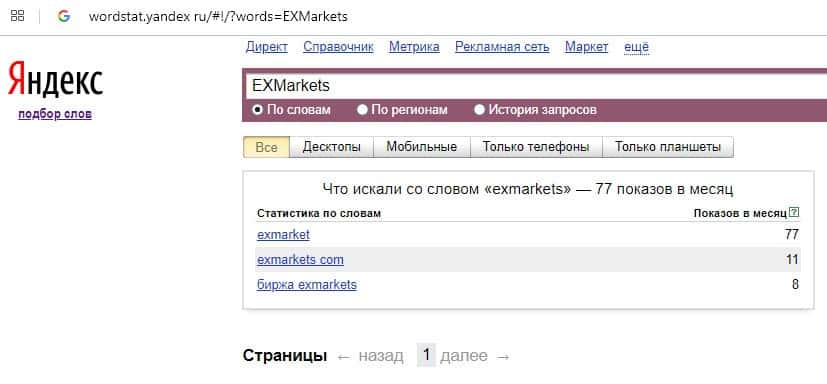 Количество запросов по бренду англоязычного названия компании "EXMarkets" на wordstat yandex ru составляет 77 показов за месяц.