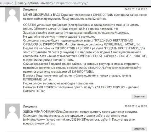 Обиженный клиент компанией Эксперт Опцион пишет отзывы на 52 сайтах, чтобы предупредить остальных потенциальных жертв от лап мошенников. Брокерская контора разводит незаметно, поэтому будьте бдительными и внимательными. Далее кинутая женщина предлагает советы начинающим трейдерам: снимать видео и делать скриншоты своего счета, оставлять переписку с мошенниками для доказательства, подать жалобу в ЦРОФР в разделе "ПОДАТЬ ПРЕТЕНЗИЮ" и сохраните номер своего торгового счета.