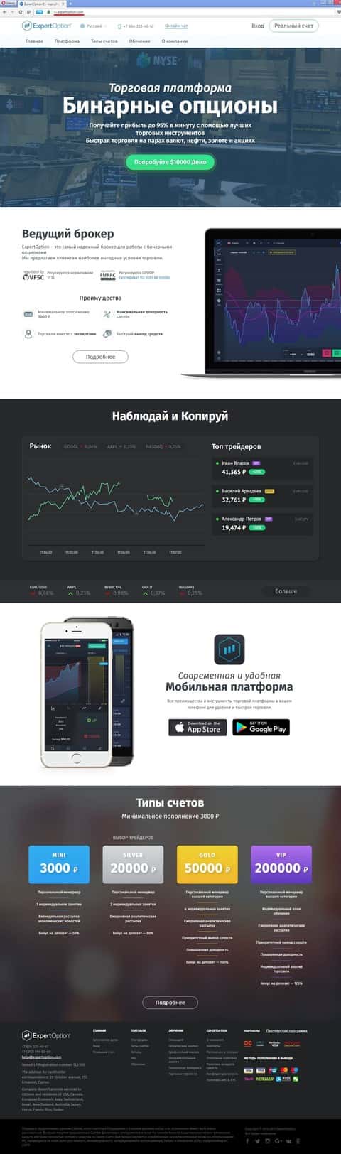 Что до самого ресурса expertoption com, то это привычный корпоративный коммерческий сайт, задача которого заманить клиента, а скорее, добыть контактные сведения еще об одном лохе. Стоимость официального интернет-сайта Expertoption, по нашим чисто субъективным оценкам, в районе от 150 до 300 тыс. рублей, возможно чутка дороже, но порядок стоимости такой.