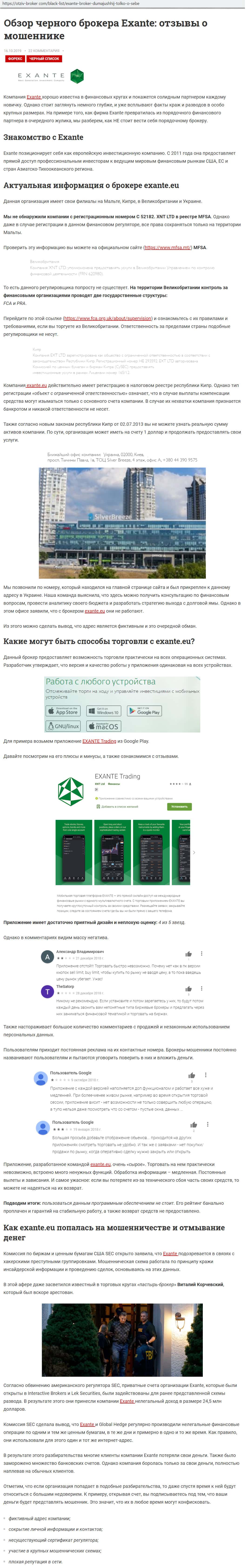 - Статья о мошеннической компании EXANTE на сайте Отзыв-Брокер Ком