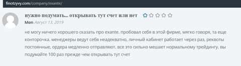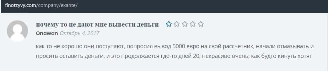 Далее предлагаем ознакомиться с жалобой от одного пострадавшего от деятельности конторы Экзанте о том, что шулера не вывели деньги со счета.