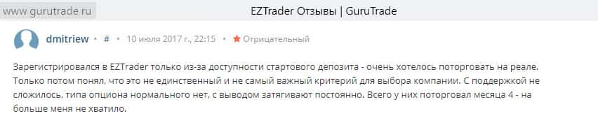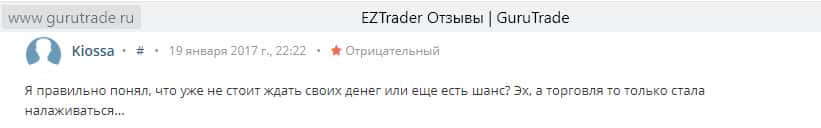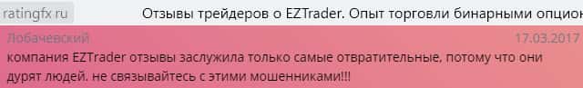 Хоть мошенническая контора ЕЗ Трейдер была прикрыта довольно давно, отзывы о ней всё еще можно найти на просторах Сети. Реальные отзывы о кидалах EZTrader варьируются между нейтральными и очень негативными, где пользователи жалуются на ужасную работу сервиса, в котором клиент ставится в самый низ пищевой цепочки, его деньги же для аферистов превыше всего.