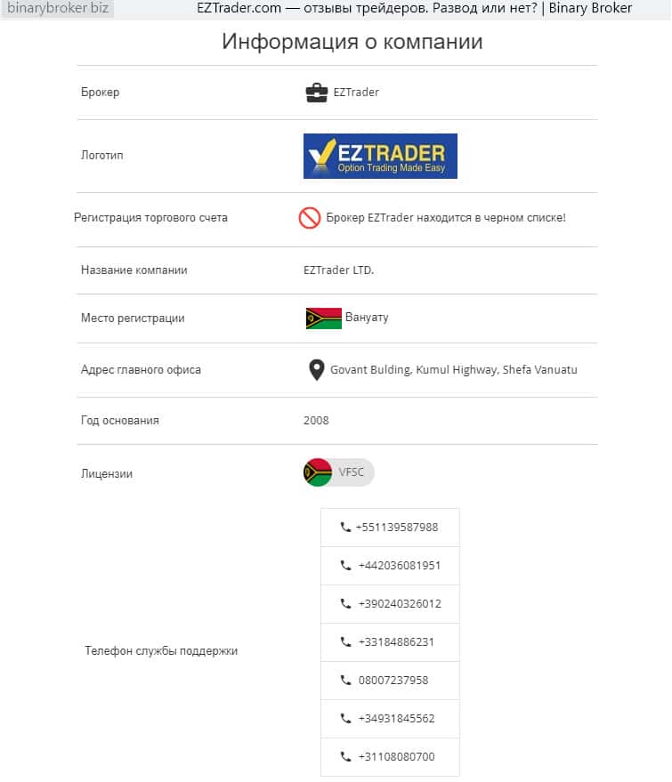 До того, как контора ЕЗ Трейдер соскамилась, она была зарегистрирована якобы в оффшор-государстве Вануату. Стоит ли говорить, что расположение онлайн-брокера в оффшор государстве не говорит о нём ничего хорошего. Если брокер расположен в оффшоре, то, как пить дать, он является мошенником. Адрес: