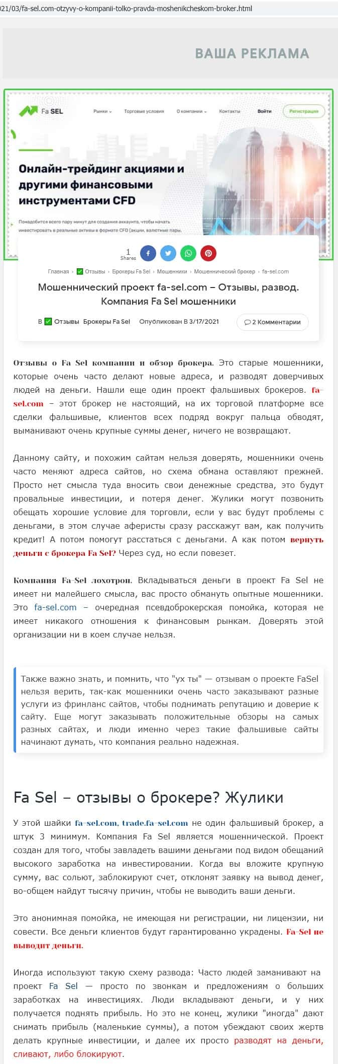 О мошенничестве на брокерской площадке Фа Сел рассказывается также в статье на портале rabota-zarabotok ru, где авторы предупреждают быть внимательными прежде чем вкладывать деньги.