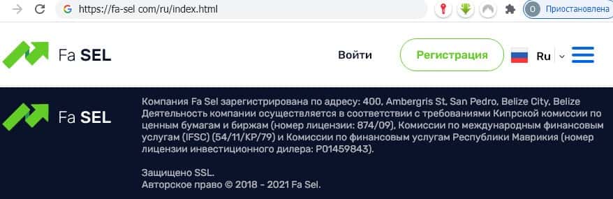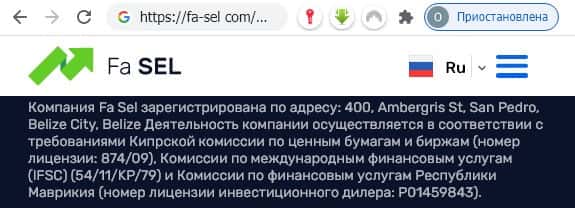 По заявлению мошенников юридическим лицом жульнического брокерского проекта Fa Sel является одноименная компания, зарегистрированная в государстве Белиз, расположенном в центральной Америке.