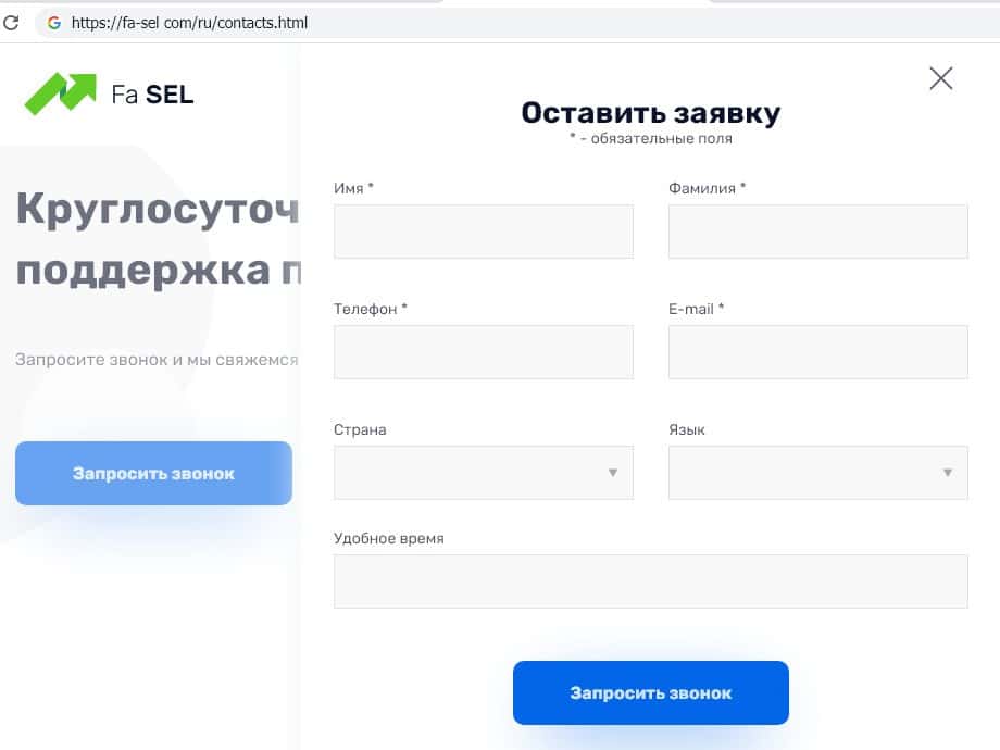 На странице контактов брокерской конторы Фа Сел перво-наперво предлагается услуга обратного звонка. При этом у Вас потребуют ввести фамилию, имя, телефон и даже электронную почту.