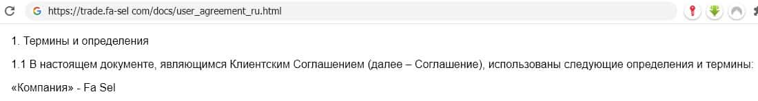Для более скрупулёзного изучения клиентского соглашения брокерской шараги Фа Сел представляем ниже полный его текст, опубликованный на портале аферистов.
