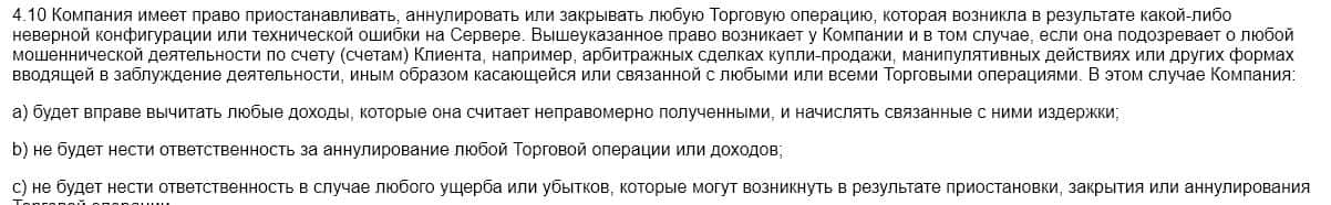 Таким же образом компания имеет право приостановить проведение транзакции и отменить любую сделку трейдера без объяснений и отчетов о своих действиях (п.4.10)