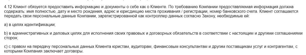 В п. 4.12 клиент обязуется передать свою персональную информацию брокерской компании Фа Сел, которая не обязуется сохранять её в тайне и будет передавать третьим лицам.