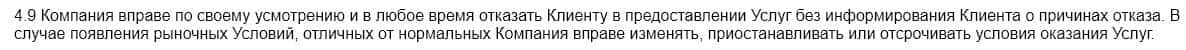 В п.4.9 компания декларирует свое право в любой момент прекратить обслуживание клиента без объяснения причин, и как следствие возврата вложенных средств трейдера.