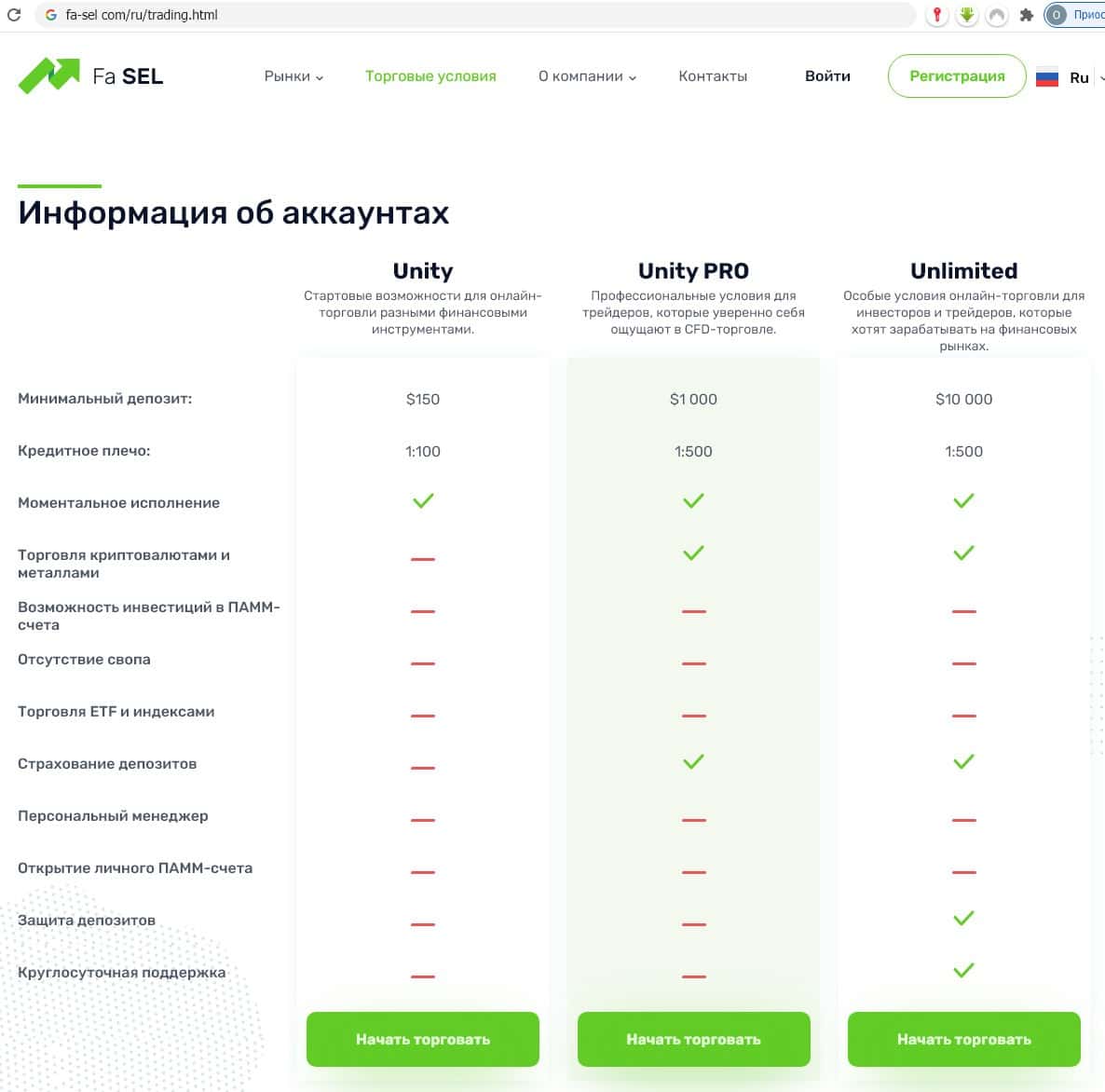 Мошенники Фа Сел предлагают три типа счетов с депозитами от 150 до 10 000 долларов. Анализируя характеристики этих счетов, остаётся пожалеть трейдера, подписавшегося под любым из них.