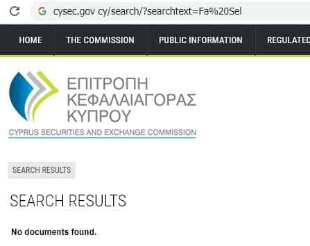 Но, как и следовало ожидать, Кипрская комиссия по ценным бумагам и биржам, CySEC, и слыхом не слыхивала ни о какой брокерской конторе Fa Sel, и никогда не выдавала им лицензии.