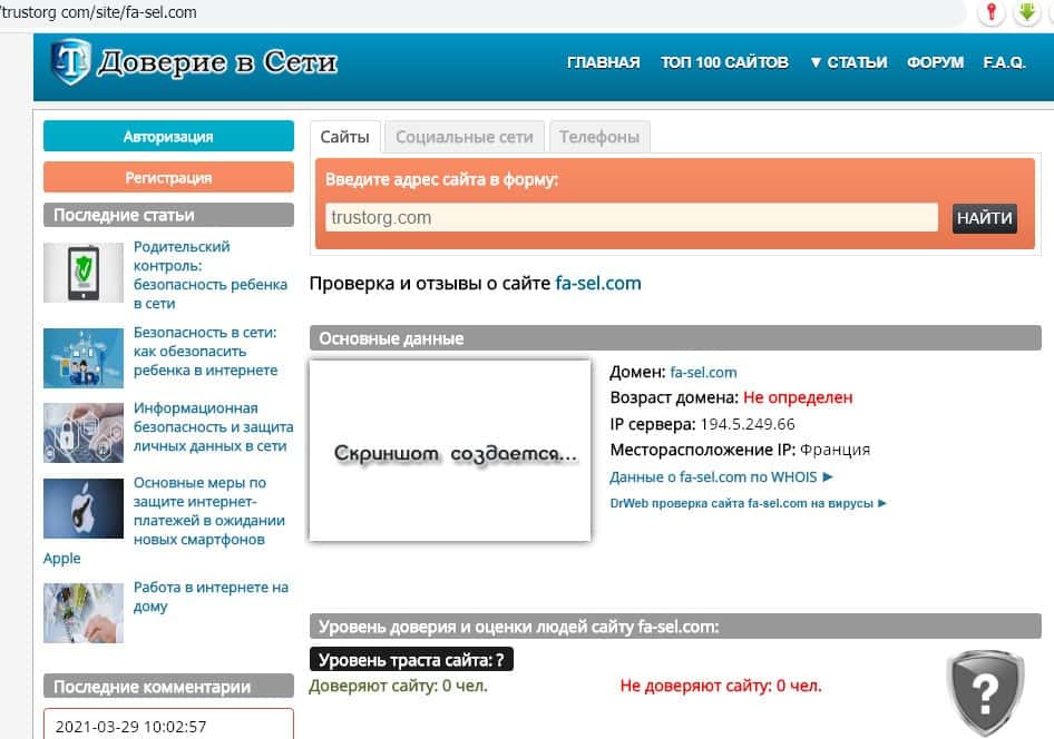 - Неопределенная оценка сайта fa-sel com на портале "Доверие в сети"