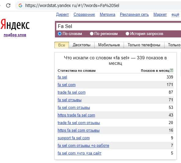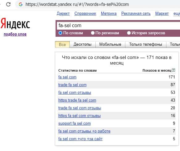 Анализ поисковых запросов "Фа Сел" в системе Яндекс показывает низкую осведомленность и заинтересованность пользователей сети в сомнительных сервисах жуликов.