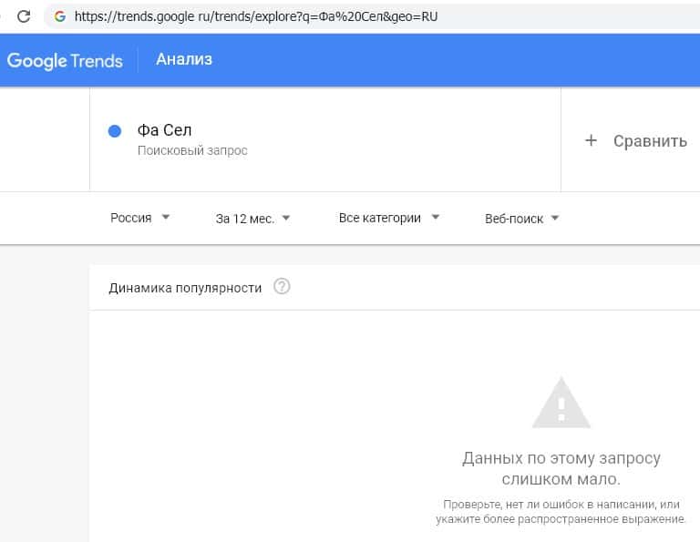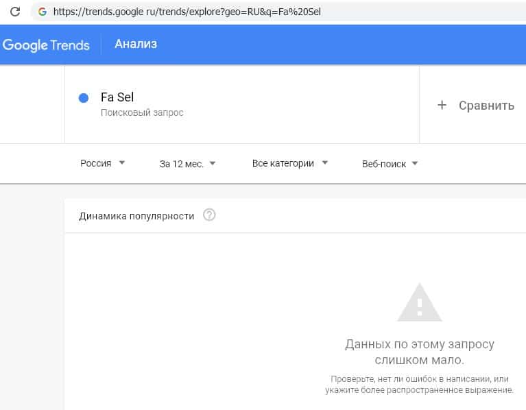 В американской поисковой системе Гугл слишком мало данных для анализа популярности бренда "Фа Сел" посредством поисковых запросов ввиду их практически полного отсутствия.