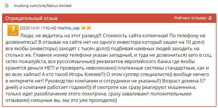Скам-организации Фабиус Лимитед пользователи глобальной сети-интернет не доверяют, подтверждением чему являются отзывы, которые предоставлены ниже.
