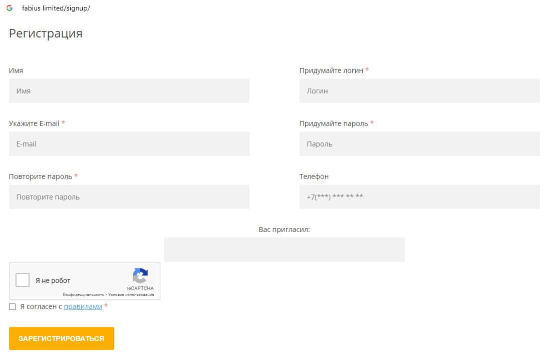Аферисты Фабиус Лимитед предлагают пользователям заполнить бланк сбора данных, где просят указать свое имя, адрес электронной почты и контактный номер телефона.