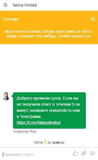 Также жулики Фабиус Лимитед предоставили в качестве обратной связи онлайн-чат, при помощи которого ведут сбор данных о клиенте, фиксируя все данные на сайте.