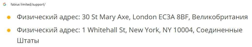 Шулера Fabius Limited также указывают адреса местонахождения офисов компании, которые вероятнее всего вымышленные: