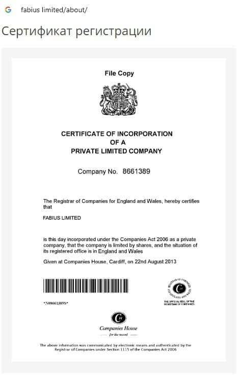 Вместо лицензии компании аферисты Fabius Limited на своем дырявом сайте предоставили сертификат о регистрации, который вероятнее всего им не принадлежит.