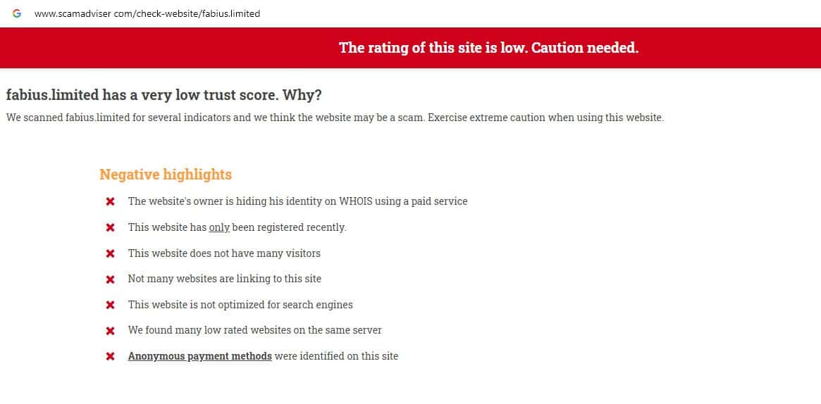 - Уровень доверия к сайту мошенников Fabius Limited низкий