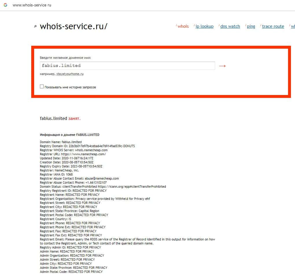 Проведя анализ данных по сайту шараги Фабиус Лимитед, не было найдено информации о владельце домена, что является еще одним признаком того, что имеем дело с лохотроном.