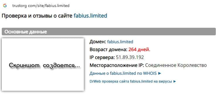 Проверка веб-сервиса обманщиков Fabius Limited на trustorg com показала, что возраст домена к моменту написания статьи составляет 264 дня, вероятнее всего домен купленный.
