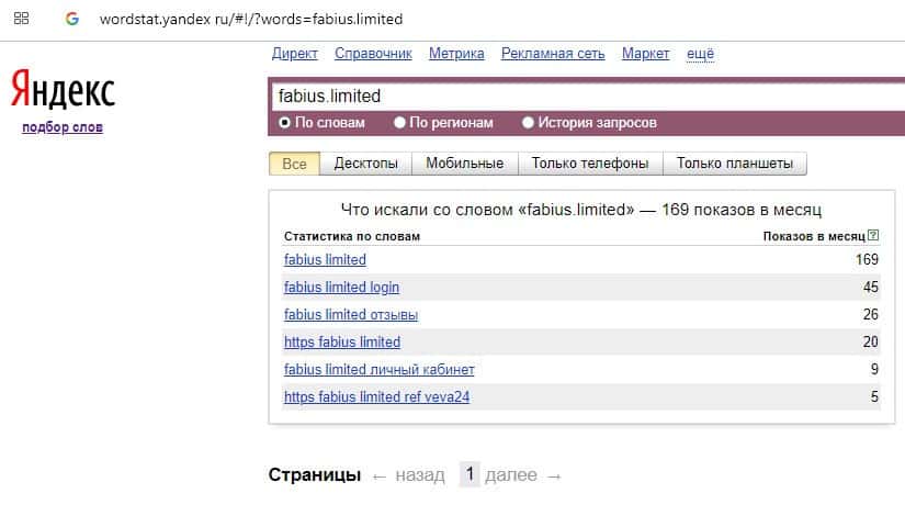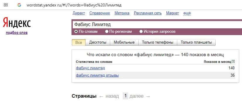 Количество брендовых запросов названия компании на русском языке "Фабиус Лимитед" на wordstat yandex ru составило 140 показов за месяц.