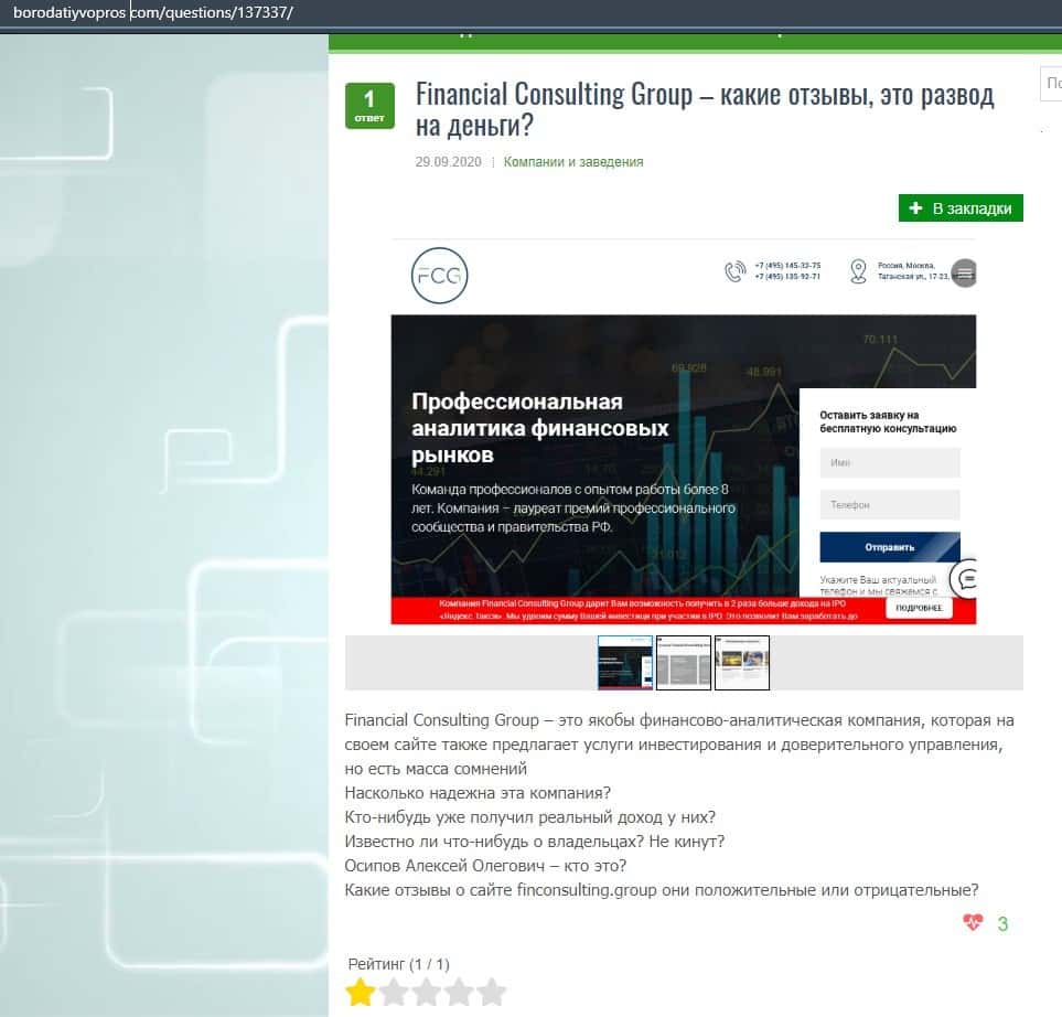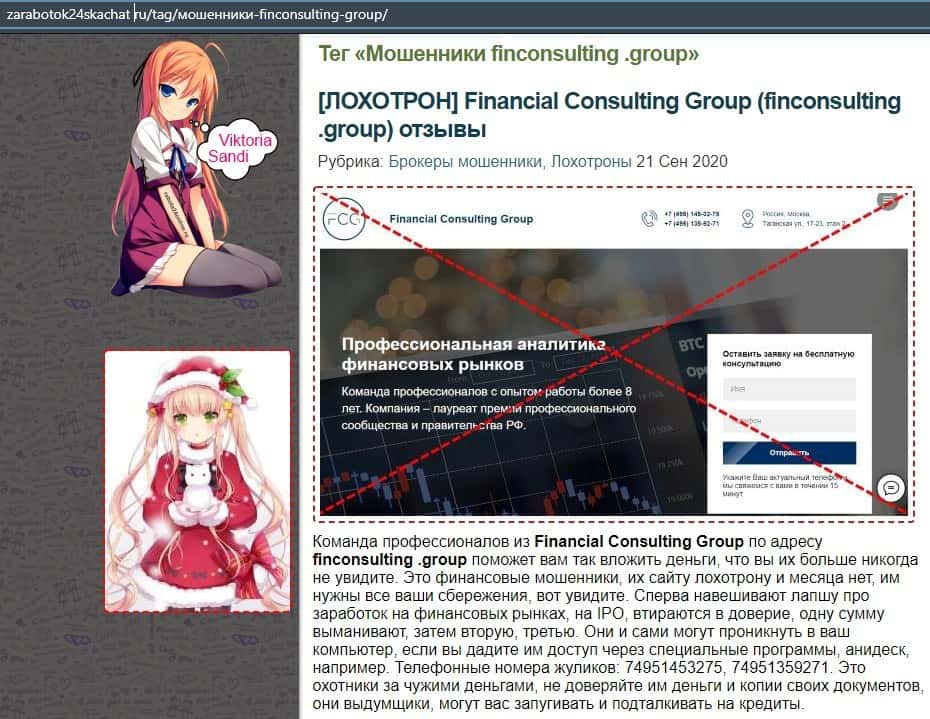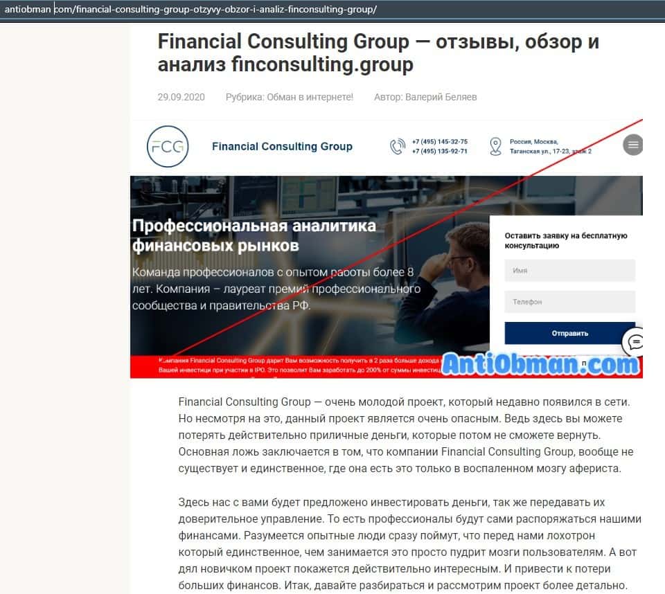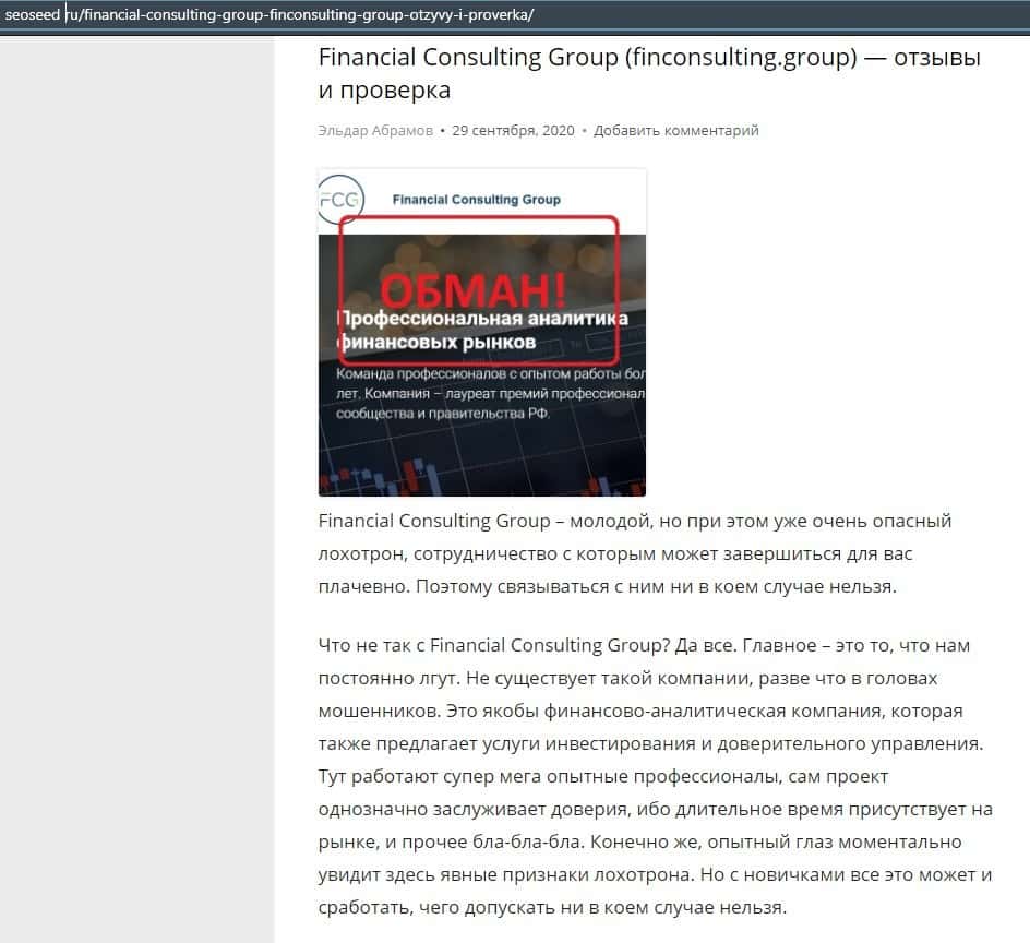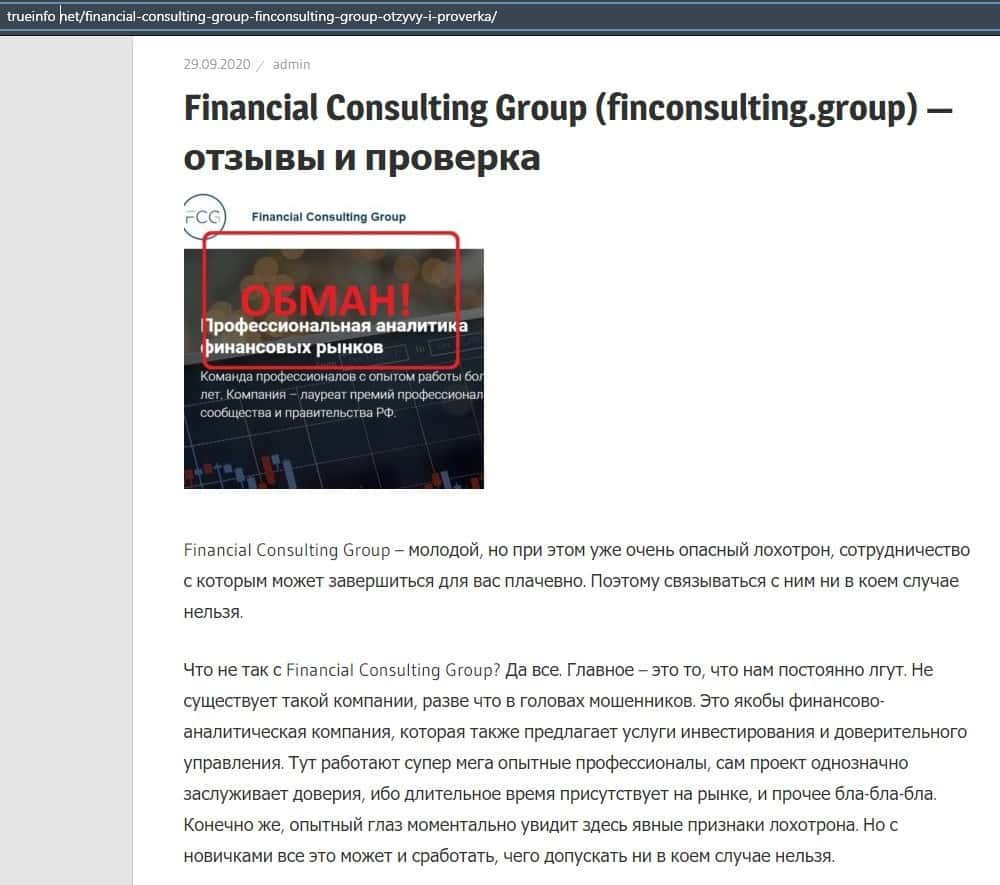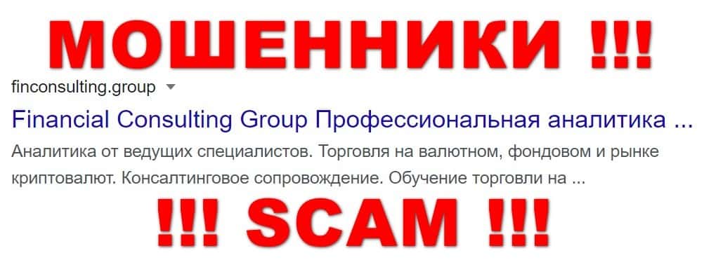 Далее представлена правдивая статья о мошенниках FinConsulting Group, где указывается, что они занимаются разводом на деньги под видом консалтинговой компании.
