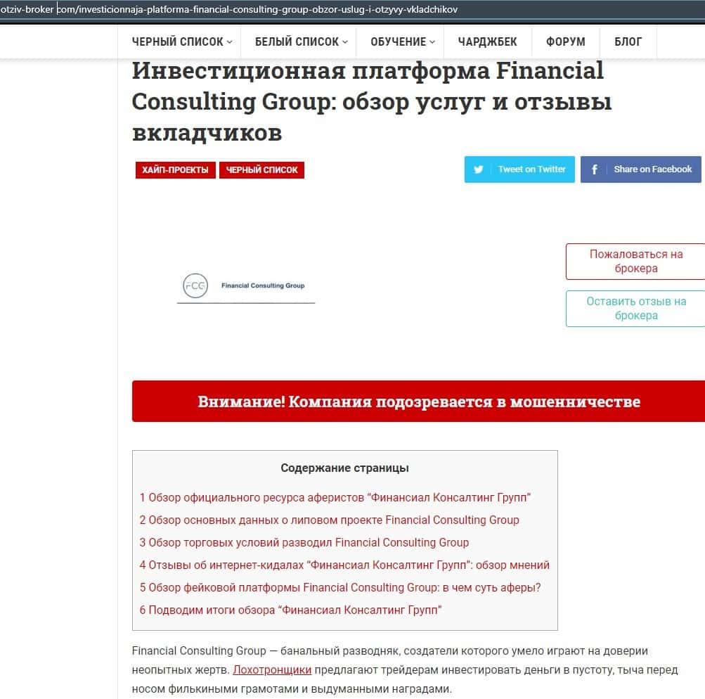 Мошенническая организация FinConsulting Group попала в обзор еще одного ресурса, где пишут что они имеют множество признаков скам-проекта, которые достаточно явные.