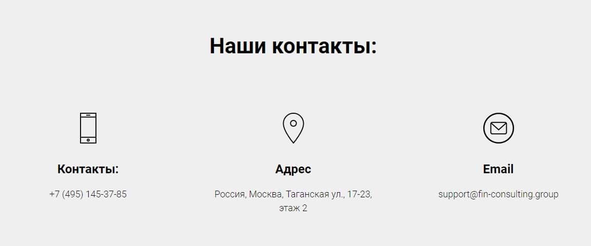 Далее представлена контактная информация мошеннической конторы Файнэншил Консалтинг, где указаны номер телефона, адрес офиса и даже электронная почта: