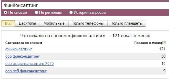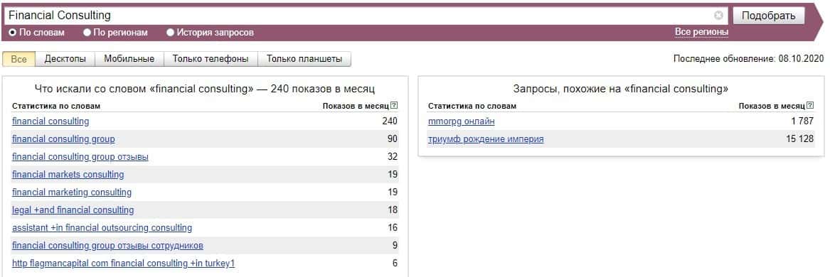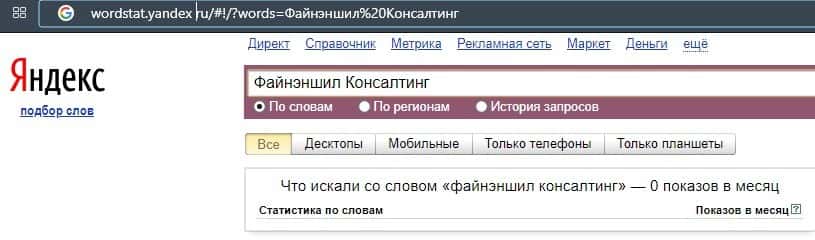 Немного другая ситуация и с англоязычным бренда "Financial Consulting", который также, по версии ресурса Яндекс.Вордстат, набрал всего 240 показов в месяц.