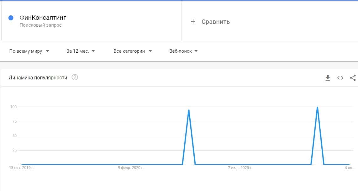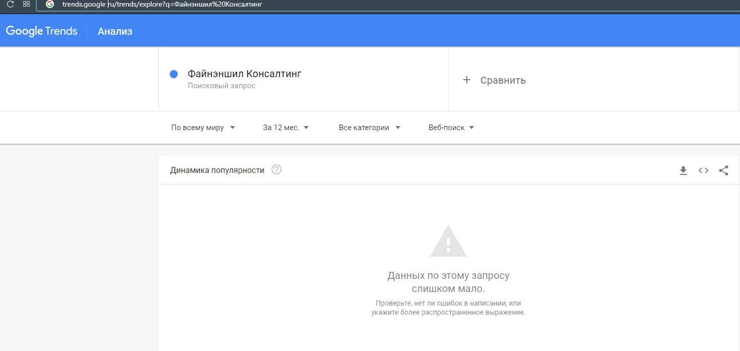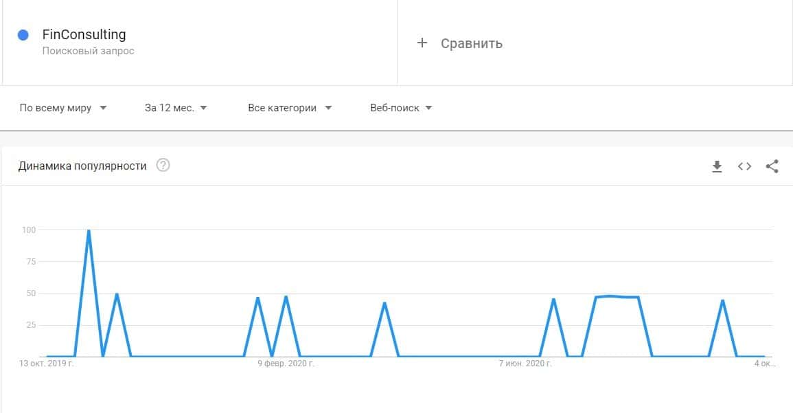 Контора имела запросы по бренду "FinConsulting", но Гугл Трендс не смогла определить источник этих запросов в поиске запросов.