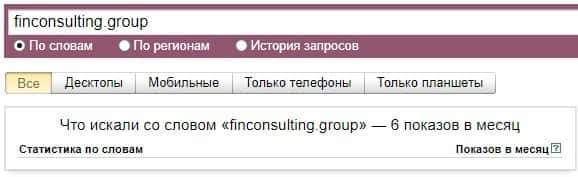 Бренд "FinConsulting.Group" по версии сайта Яндекс.Вордстат также отличился запросами в размере 6 показам за месяц, что показывает их низкую популярность.