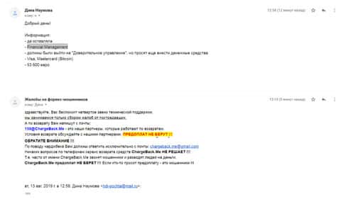 Еще одна клиентка жалуется на мошенническую контору Файненшил Менеджмент. Поначалу жулики требовали малую сумму денег, но в итоге всё дошло до достаточно большой суммы, а именно 53600 евро, и при этом требуют вложить еще. В итоге пострадавшая написала в интернет-организацию ChargeBack.Me за помощью.