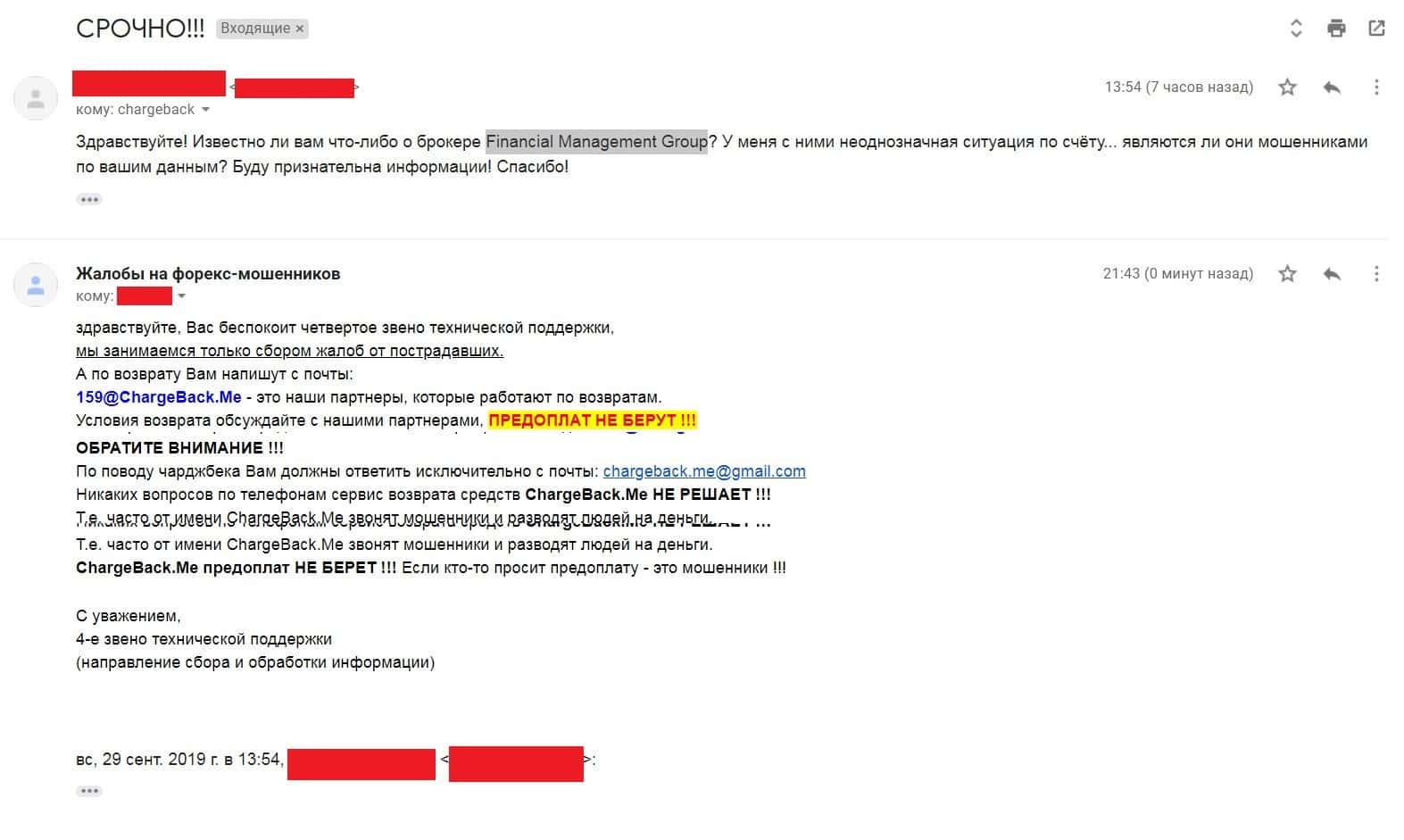Информация о Financial Management Group от потенциальной жертвы мошенничества данной конторы. В данной жалобе девушка рассказывает, как её кинула брокерская контора Financial Management. Мошенники написали своей жертве на почту с предложением заработать неплохие деньги на торговой площадке. Женщина согласилась, не подозревая, что это всё развод. Но вскоре жулики перестали выходить на связь с ней.