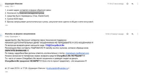 Очередная жалоба облапошенного жуликами Financial Management клиента. На изображении ниже вы можете увидеть очередную реальную жалобу в сторону шулеров Файненшил Менеджмент, которые развели наивного пользователя на 6200 евро. В данной ситуации веб-площадка форекс-брокерс про рекомендует обращаться в сервис ChargeBack.Me для возврата средств.