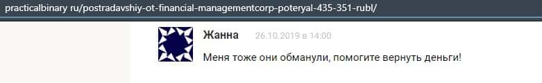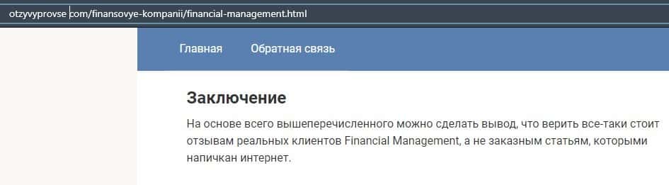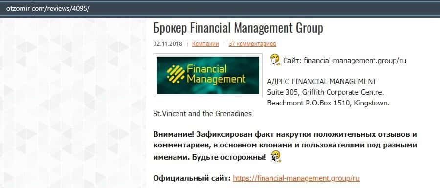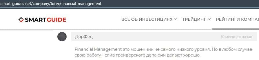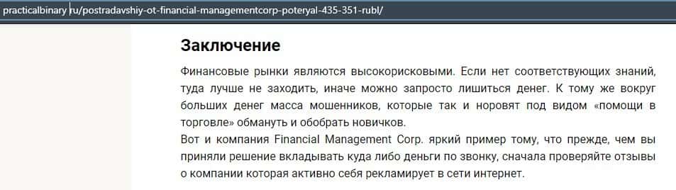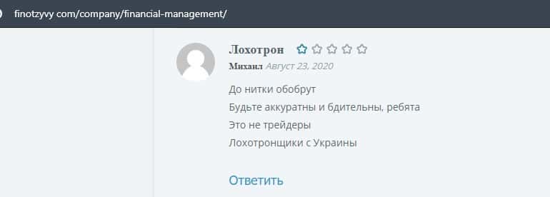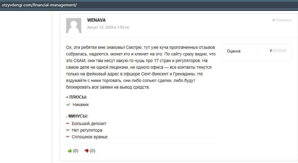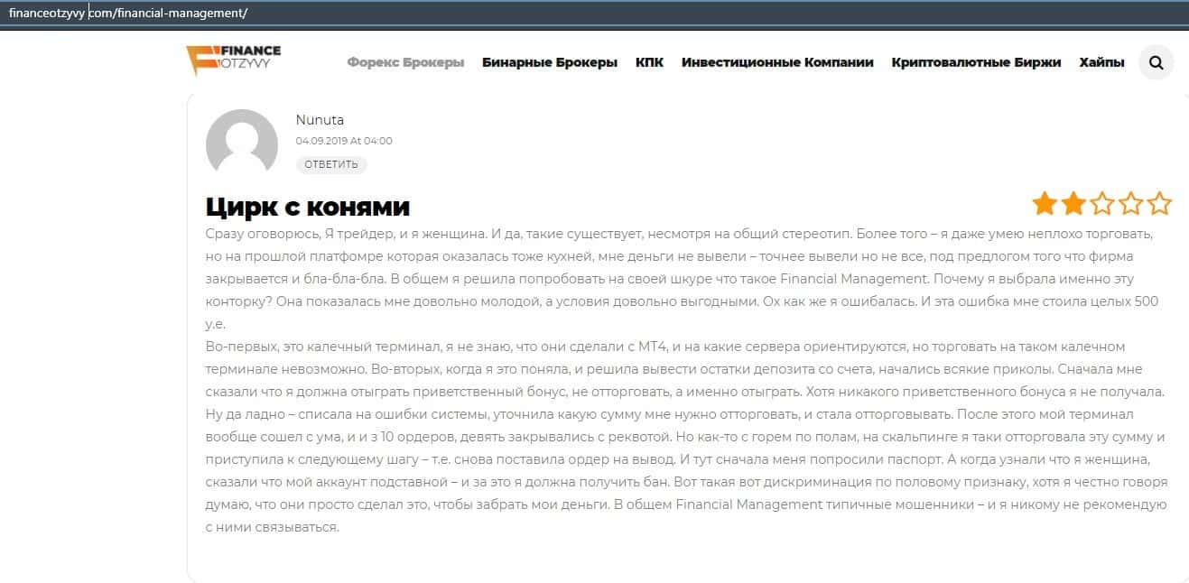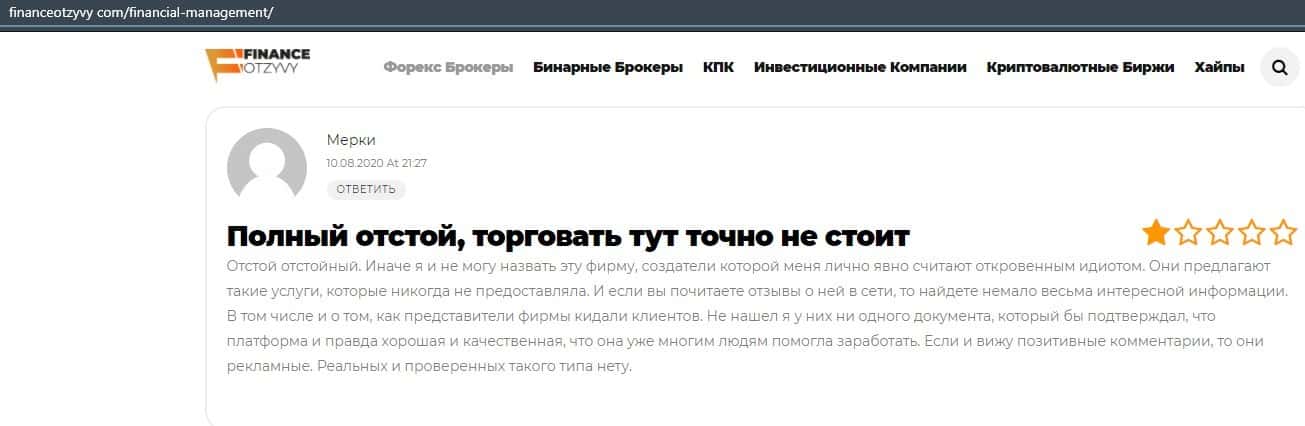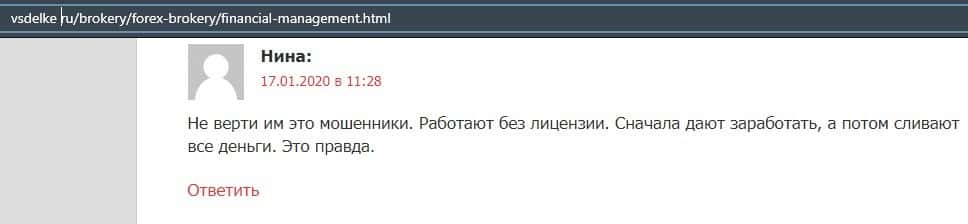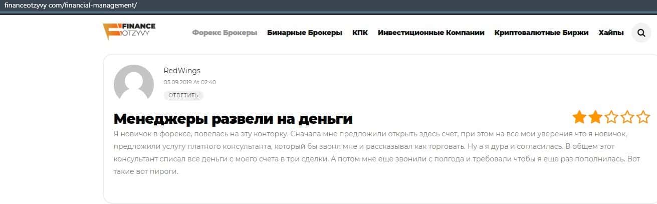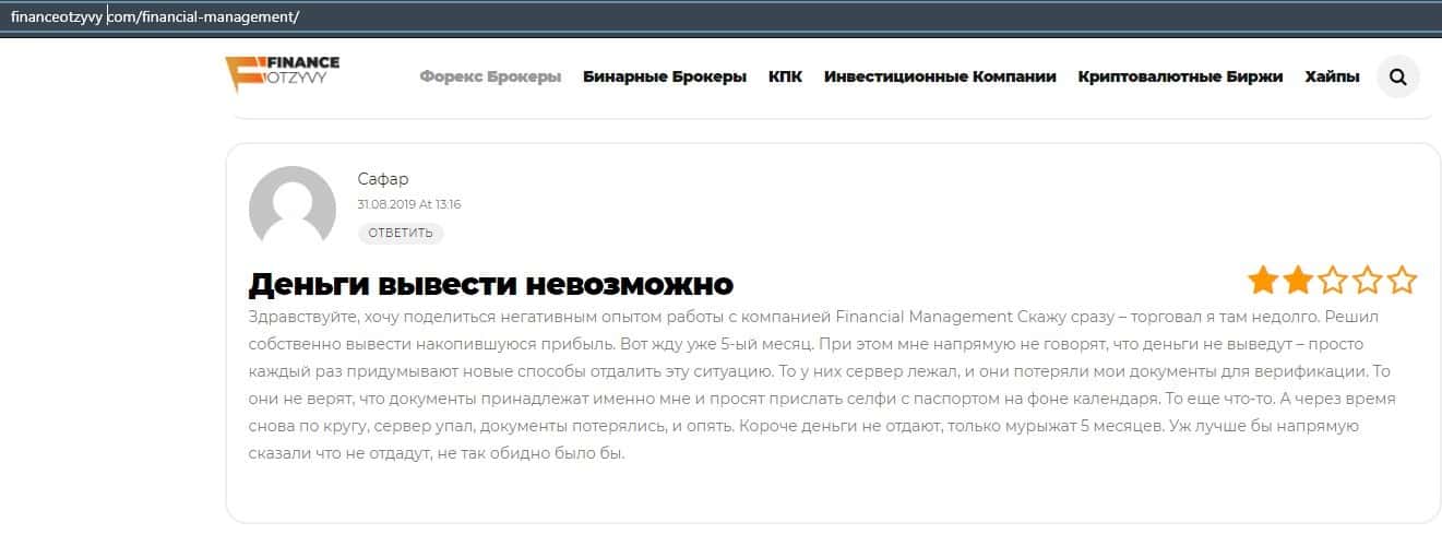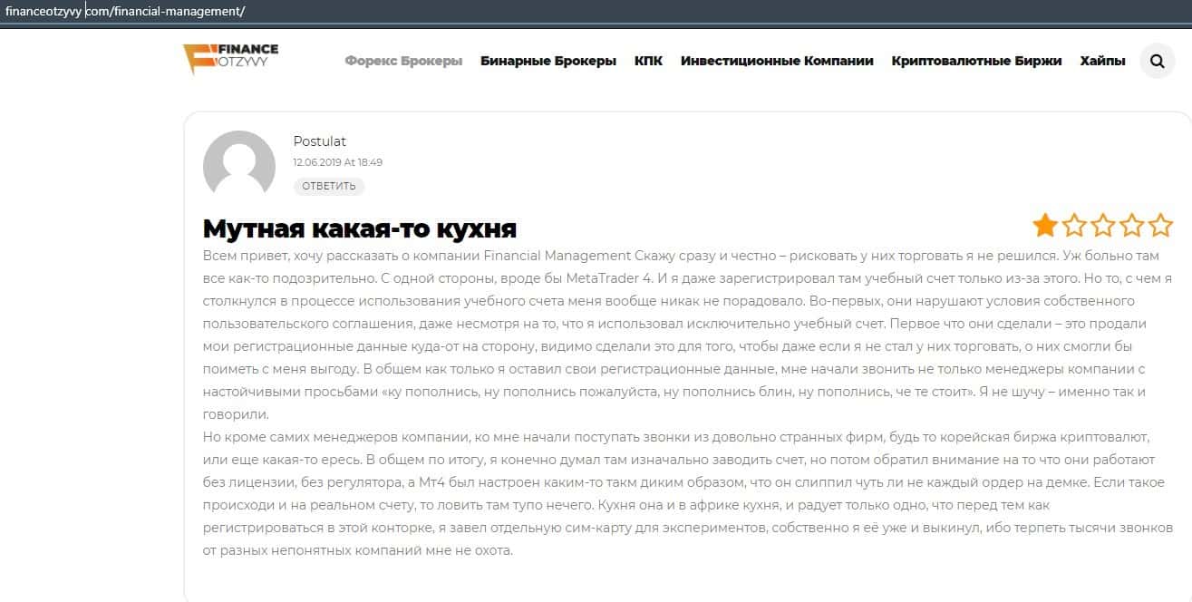 Еще один ресурс высказался не в пользу брокерской конторы Financial Management. Он предупреждает всех о мошенничестве с ее стороны, поэтому не стоит вкладывать свои деньги.