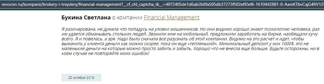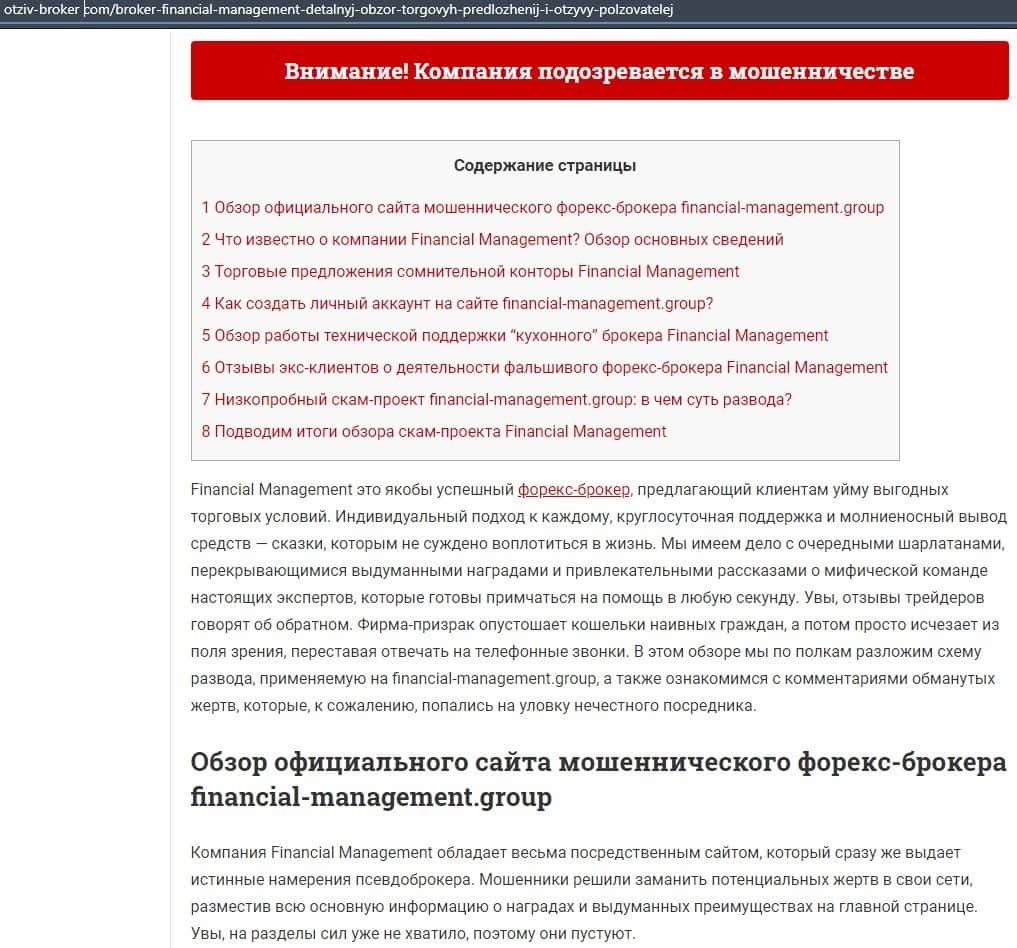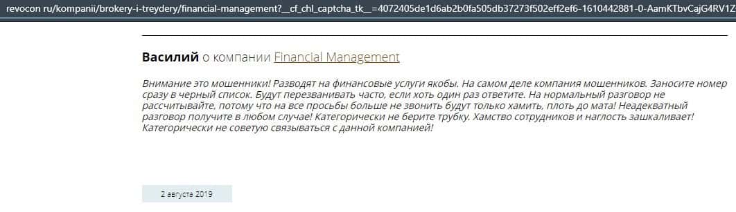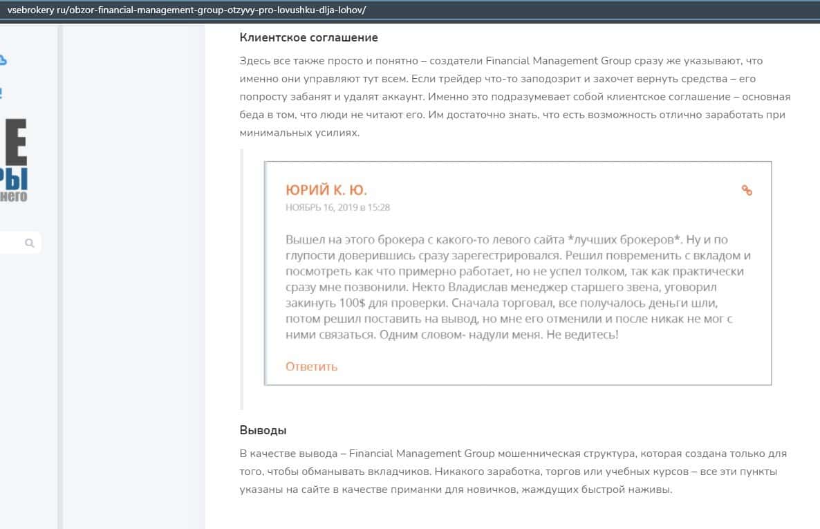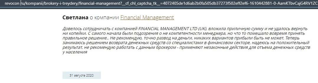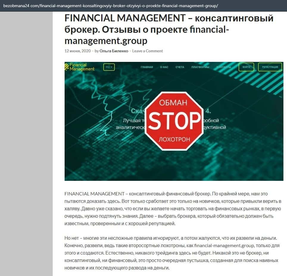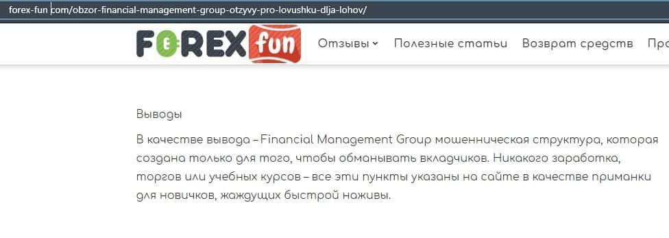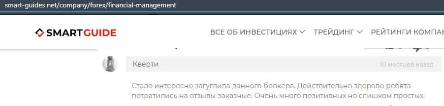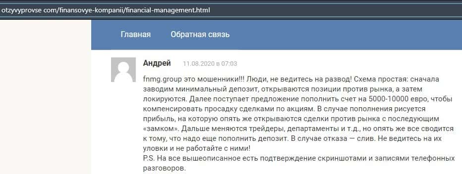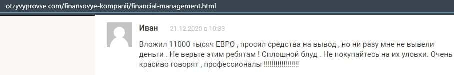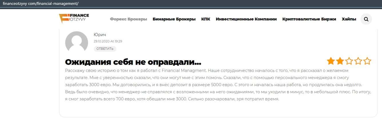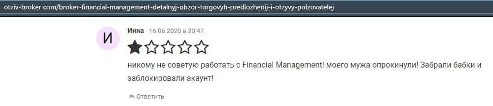 Еще один ресурс высказался не в пользу брокерской конторы Financial Management. Он предупреждает всех о мошенничестве с ее стороны, поэтому не стоит вкладывать свои деньги.