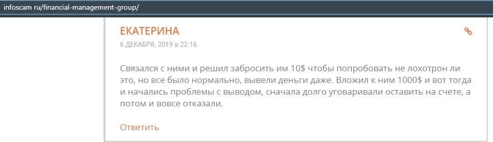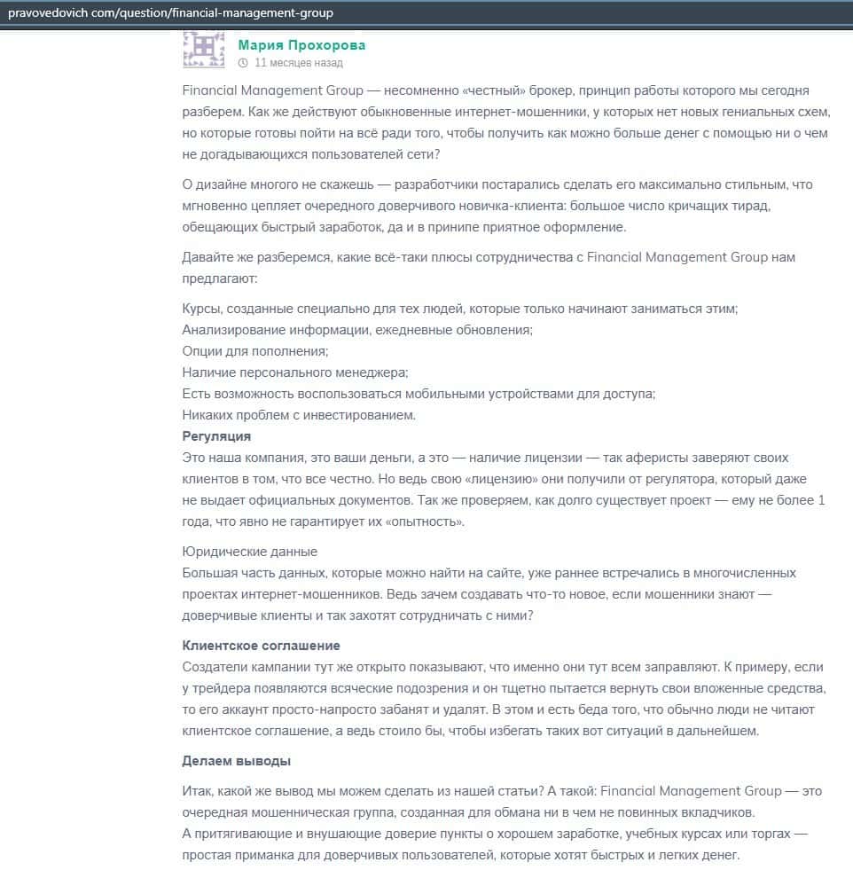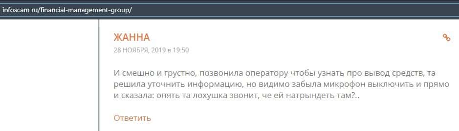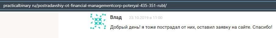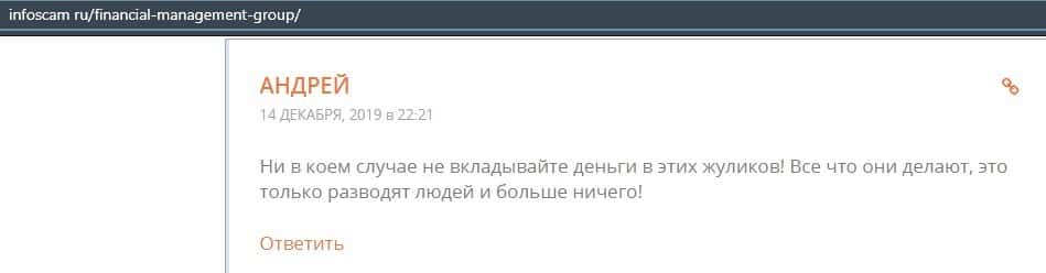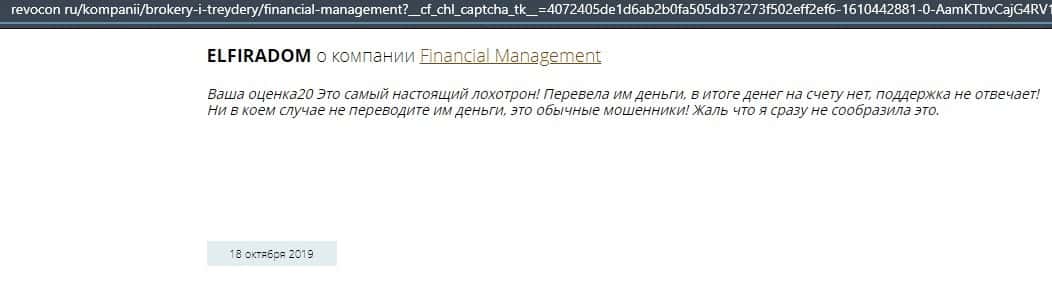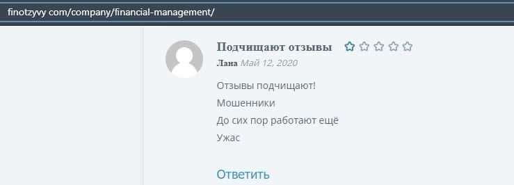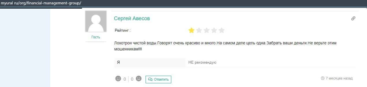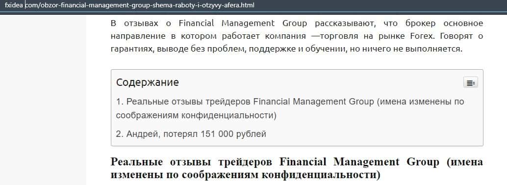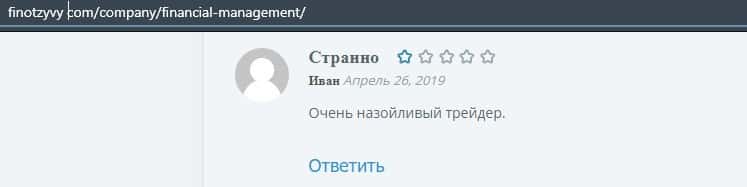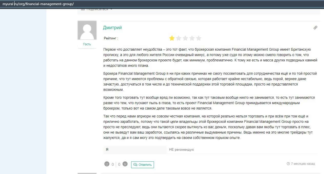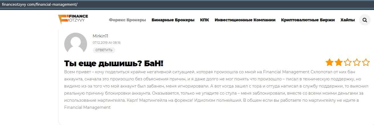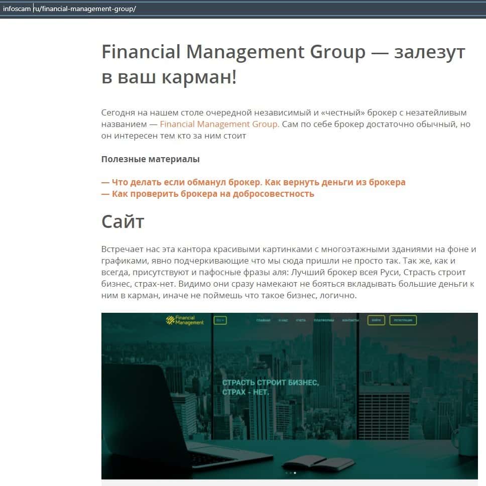 Еще один ресурс высказался не в пользу брокерской конторы Financial Management. Он предупреждает всех о мошенничестве с ее стороны, поэтому не стоит вкладывать свои деньги.