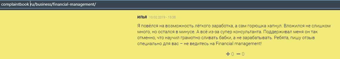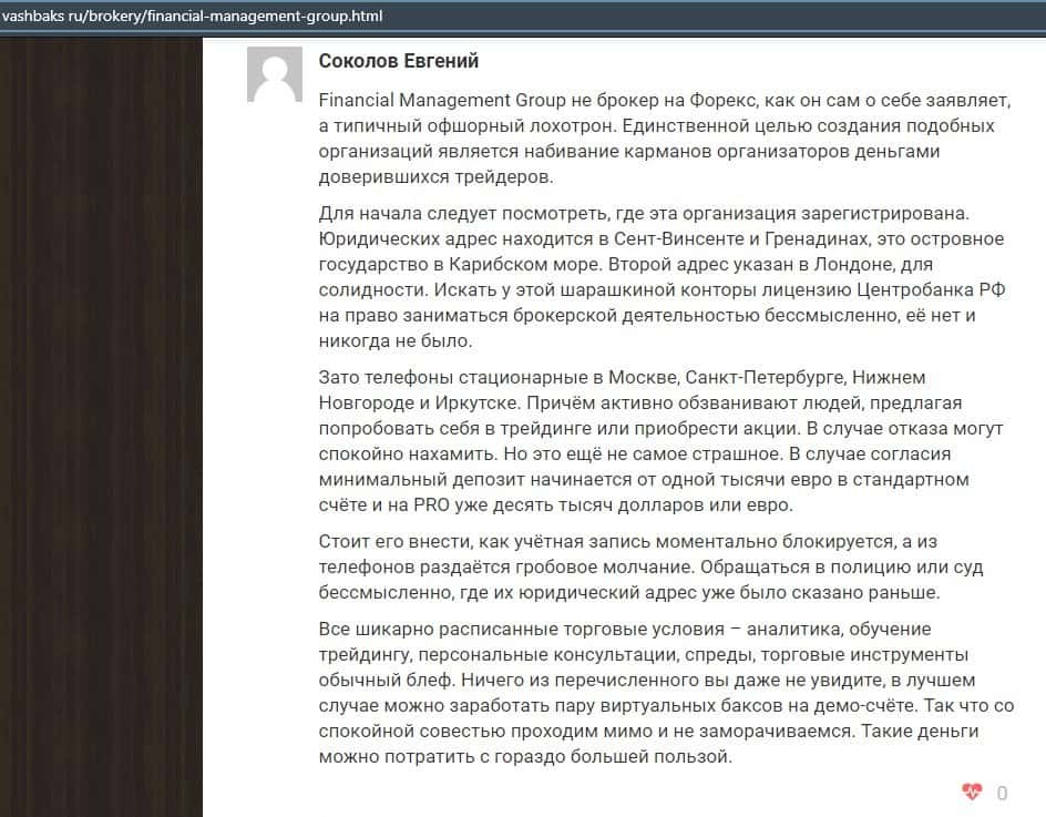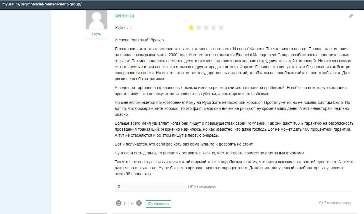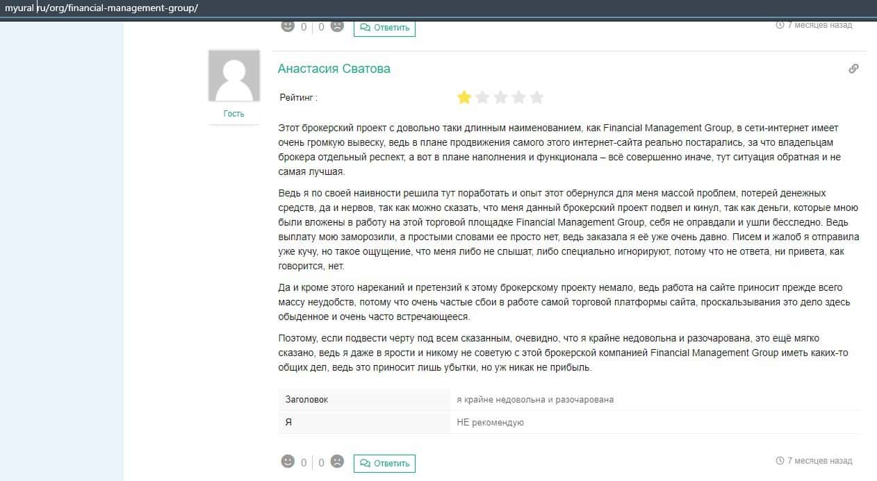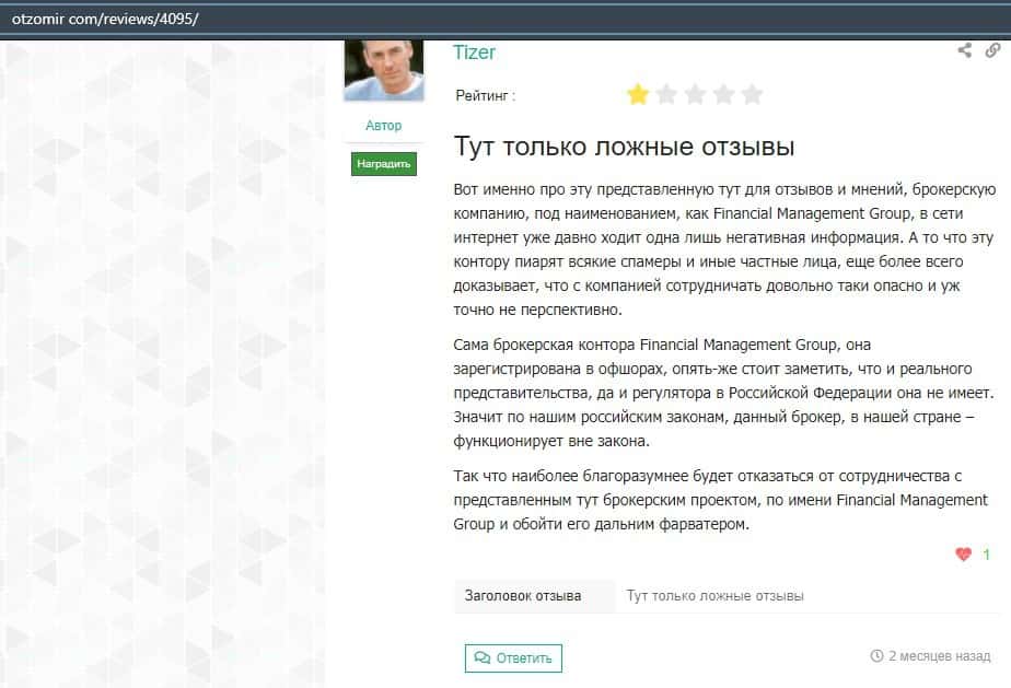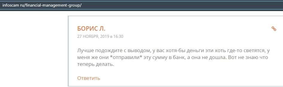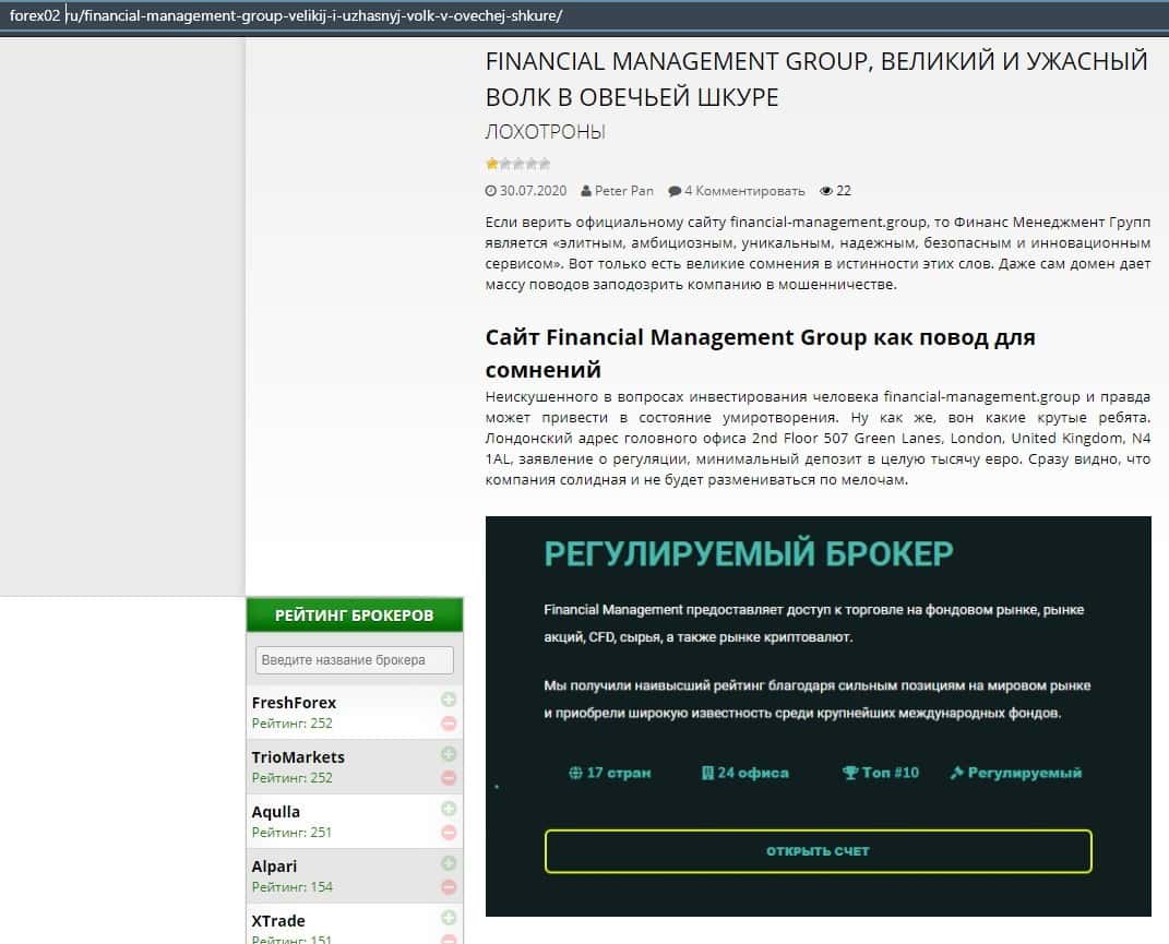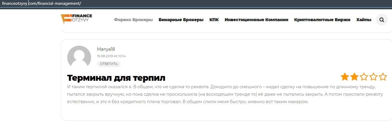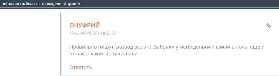 Еще один ресурс высказался не в пользу брокерской конторы Financial Management. Он предупреждает всех о мошенничестве с ее стороны, поэтому не стоит вкладывать свои деньги.