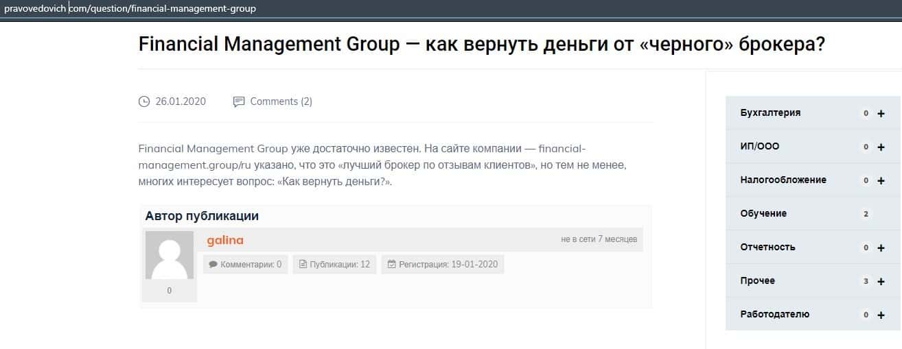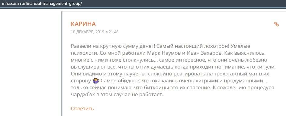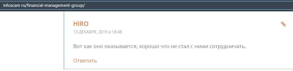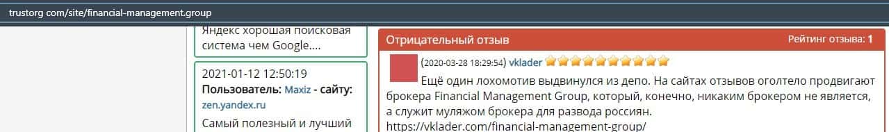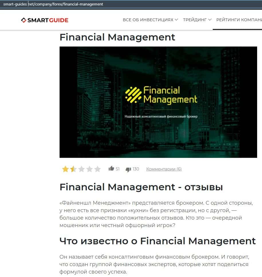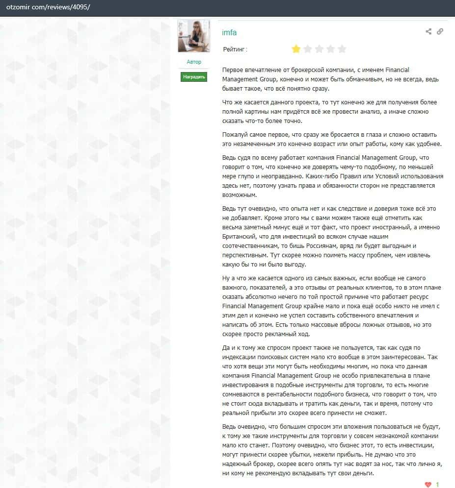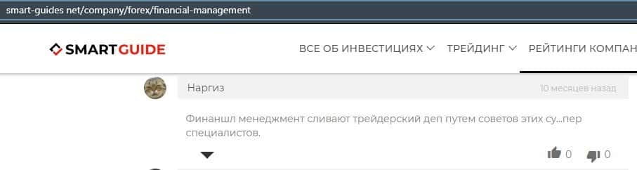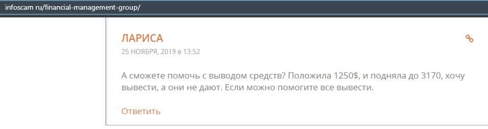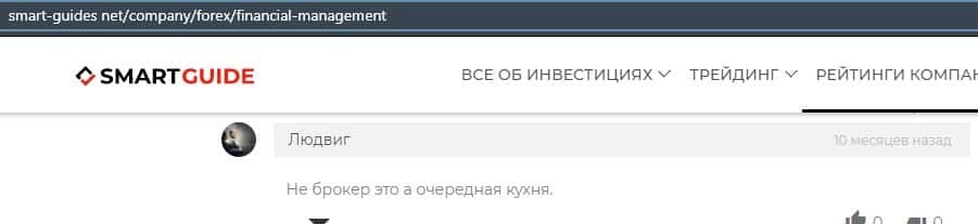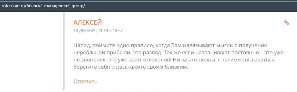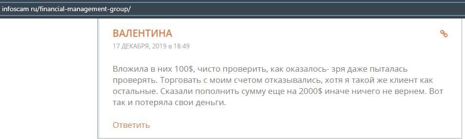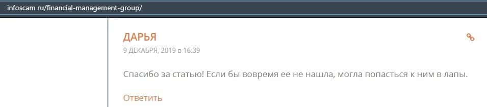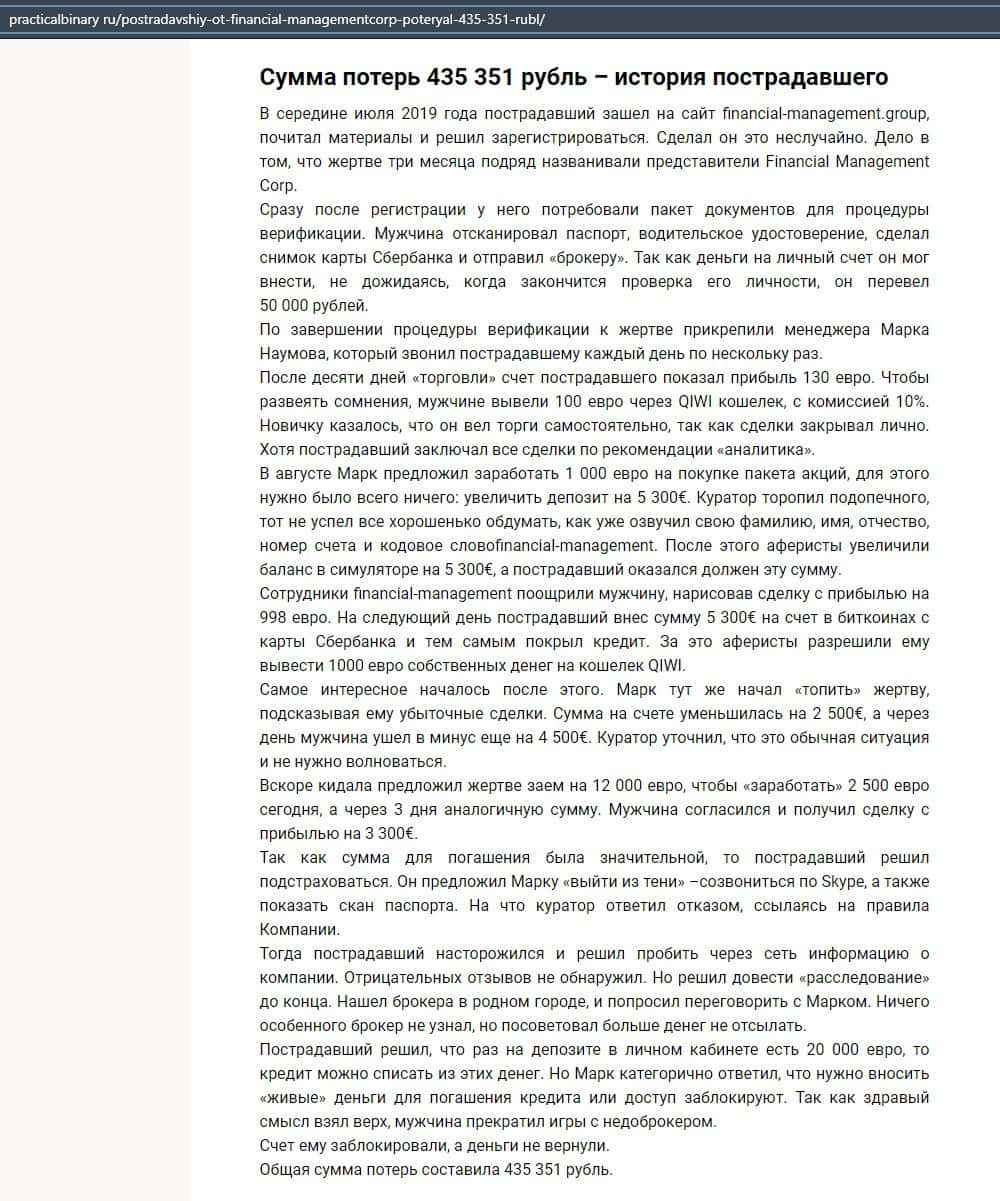 Еще один ресурс высказался не в пользу брокерской конторы Financial Management. Он предупреждает всех о мошенничестве с ее стороны, поэтому не стоит вкладывать свои деньги.