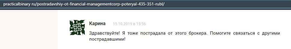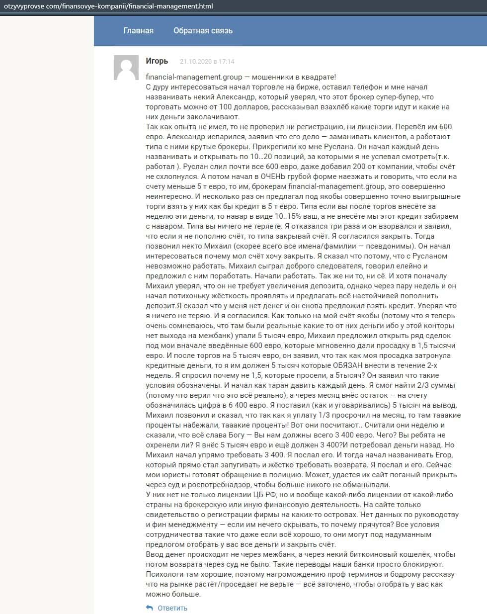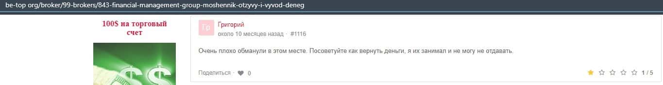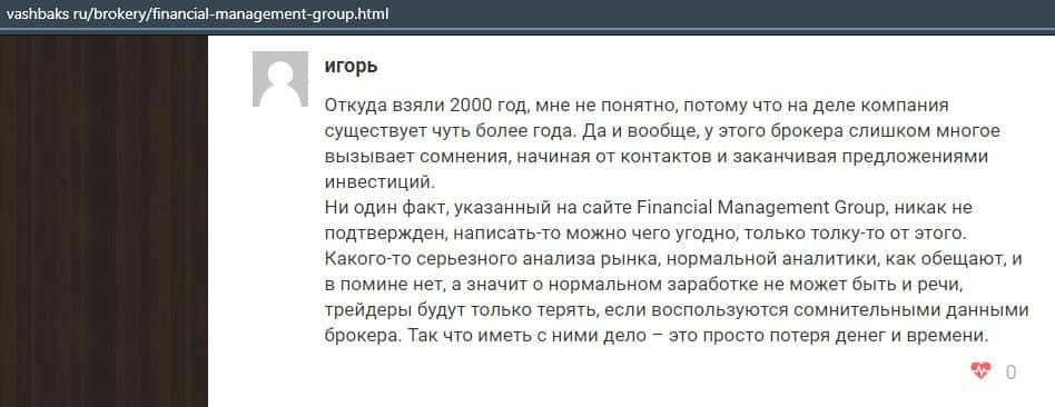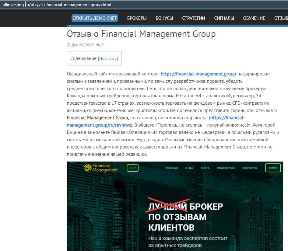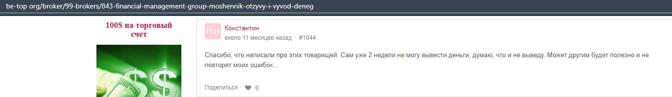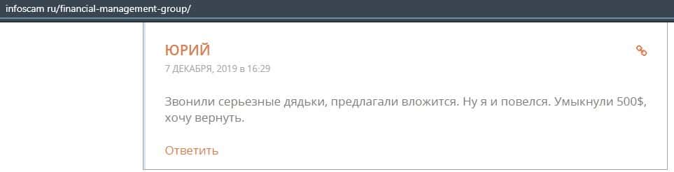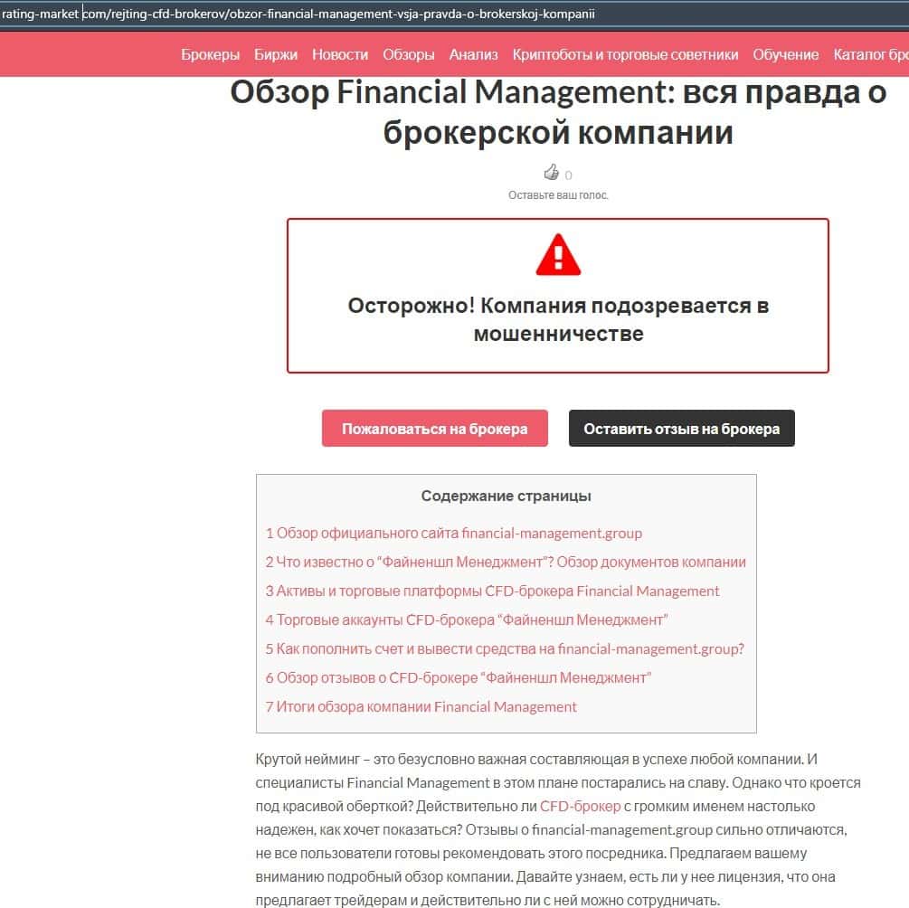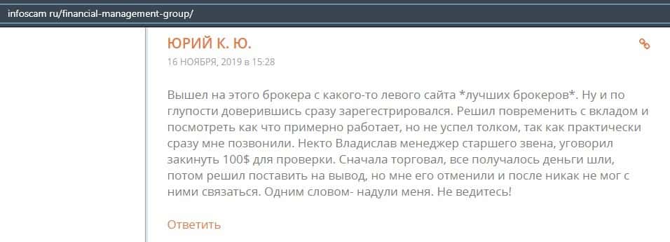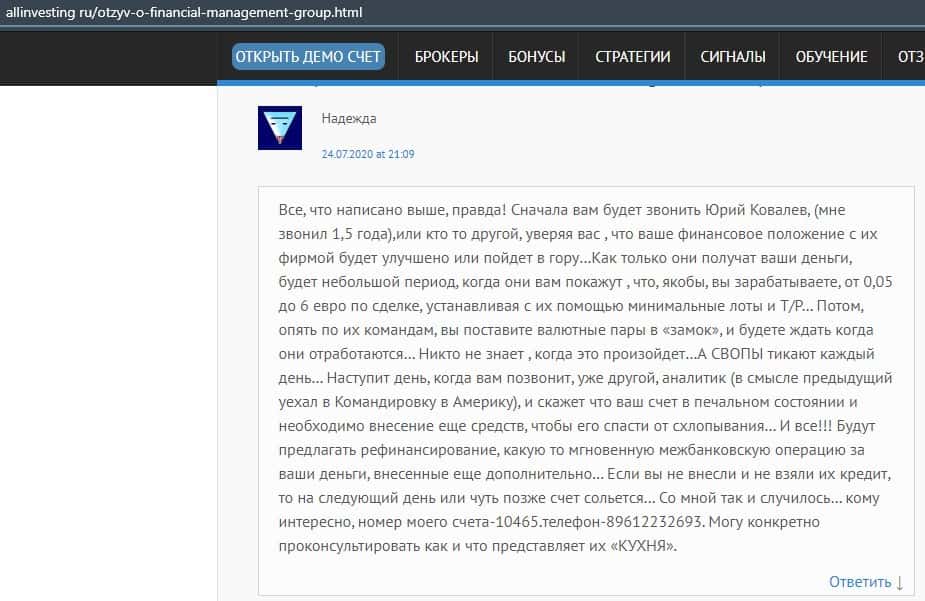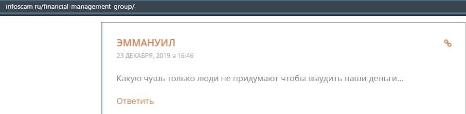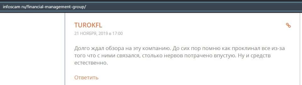 Еще один ресурс высказался не в пользу брокерской конторы Financial Management. Он предупреждает всех о мошенничестве с ее стороны, поэтому не стоит вкладывать свои деньги.
